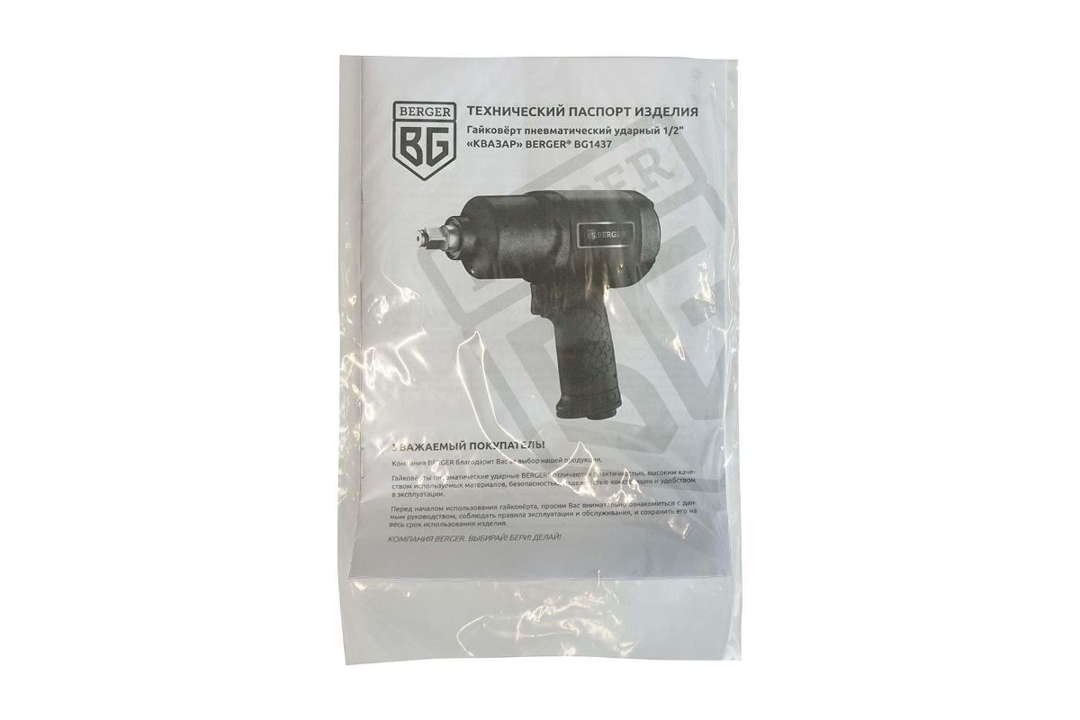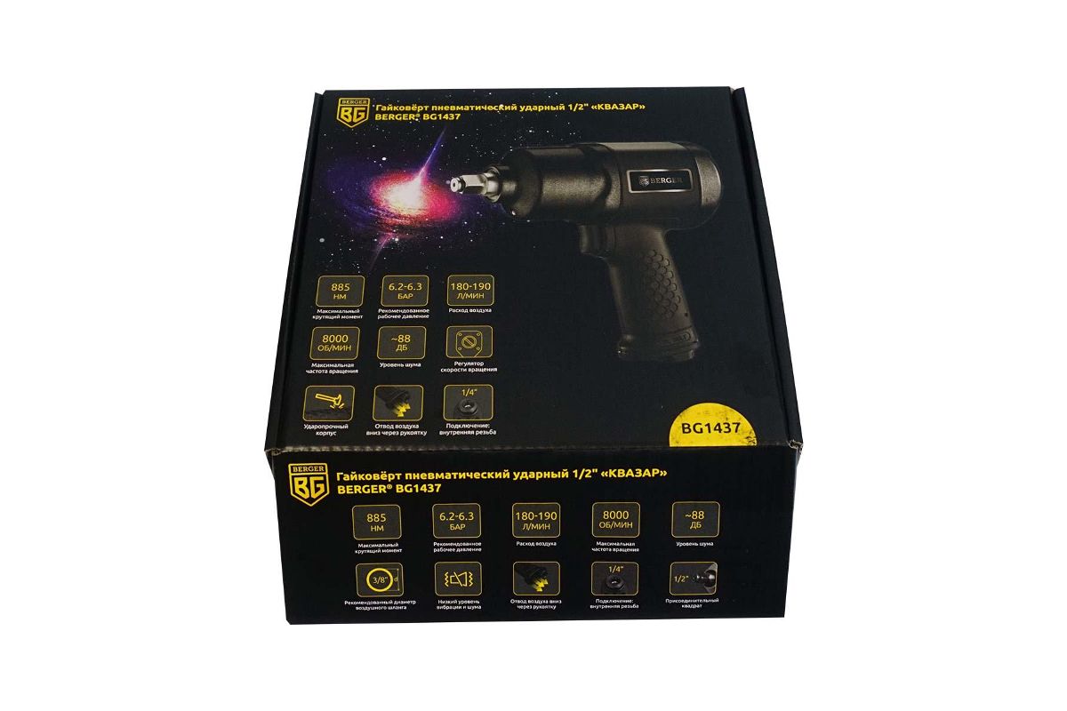 ГАЙКОВЕРТ ПНЕВМАТИЧЕСКИЙ УДАРНЫЙ 1/2 «КВАЗАР» BERGER BG1437 – универсальный компактный ударный гайковёрт профессионального качества, надёжный и комфортный в работе, простой и нетребовательный в обслуживании.