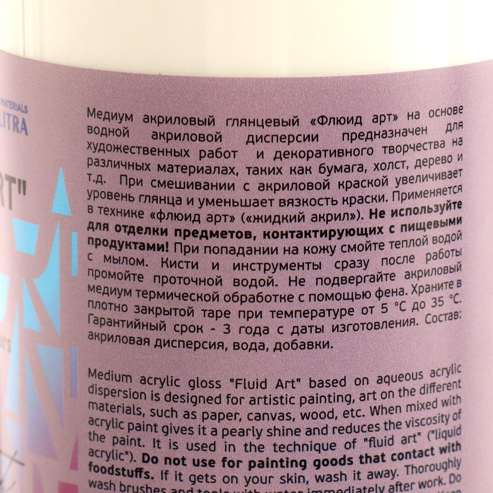 Медиум акриловый глянцевый "Флюид арт" на основе водной акриловой дисперсии предназначен для художественных работ и декоративного творчества на различных материалах, таких как бумага, холст, дерево и т.д. При смешивании с акриловой краской увеличивает уровень глянца и уменьшает вязкость краски. Применяется в технике "флюид арт" ("жидкий акрил").
