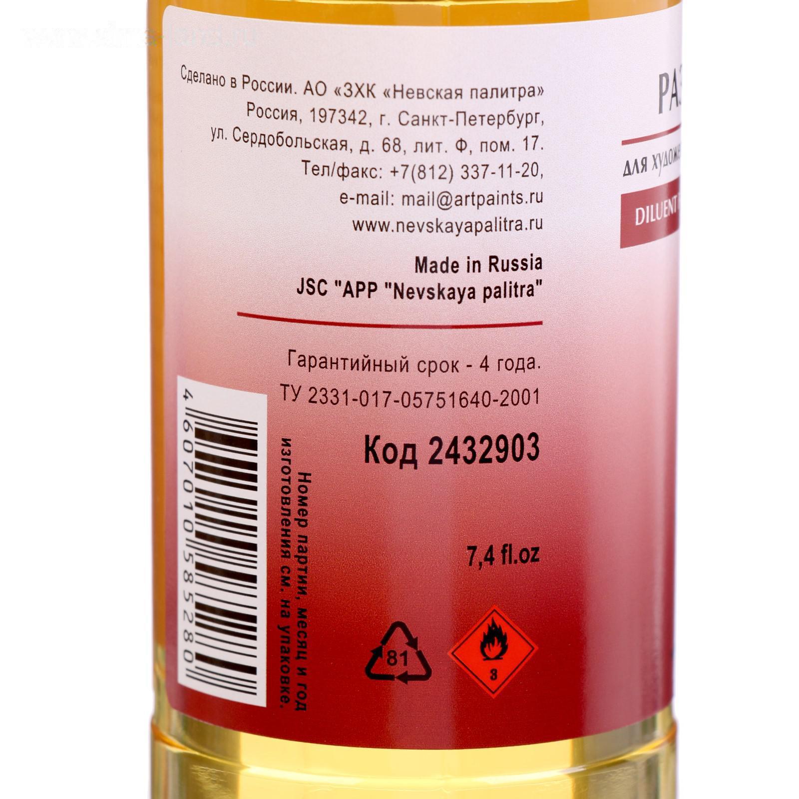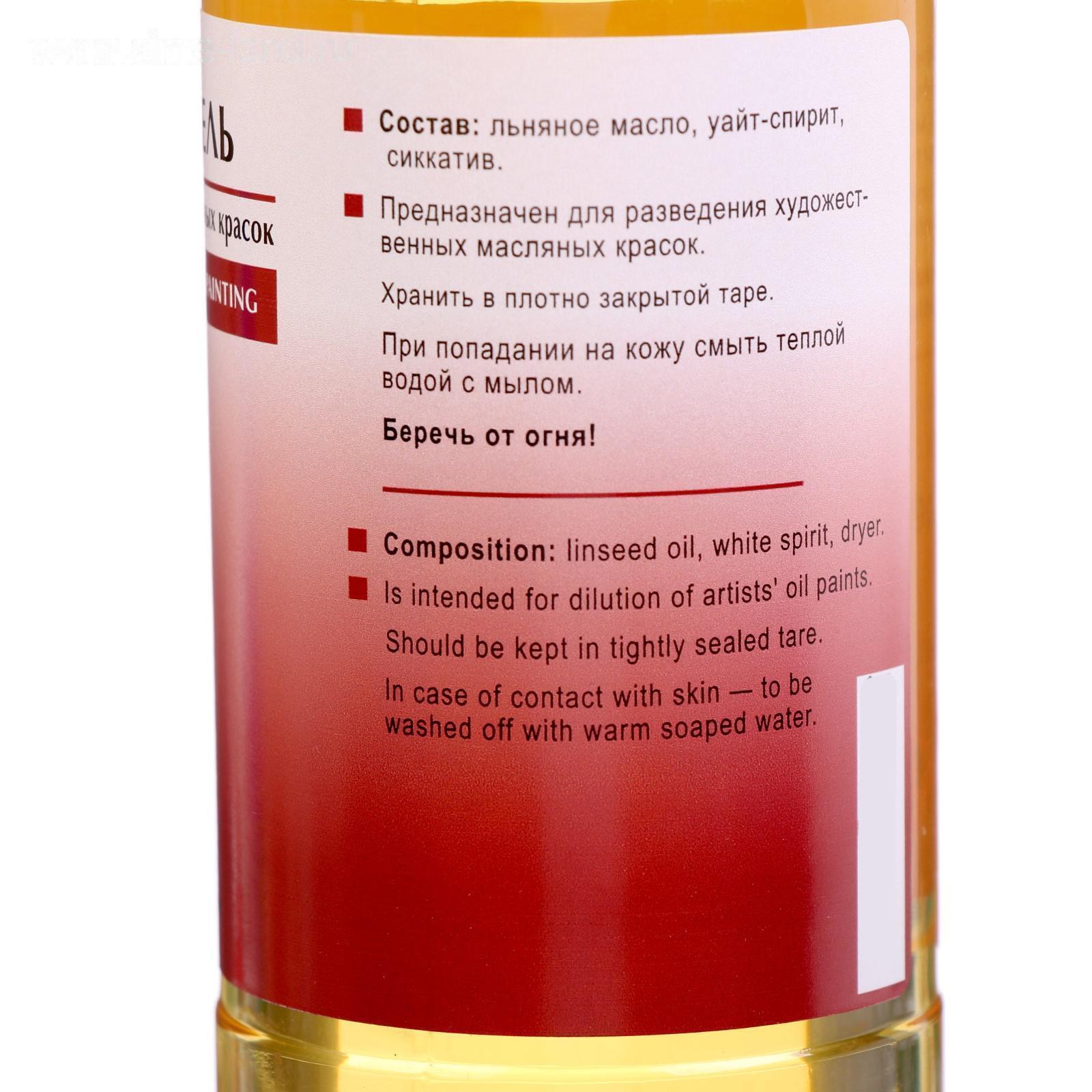 Разбавитель масляный Невская палитра. Применяется для разведение масляных, алкидных красок и для смывания красок с полотен, палитр, кистей. Состав: льняное масло, уайт-спирит, сиккатив.