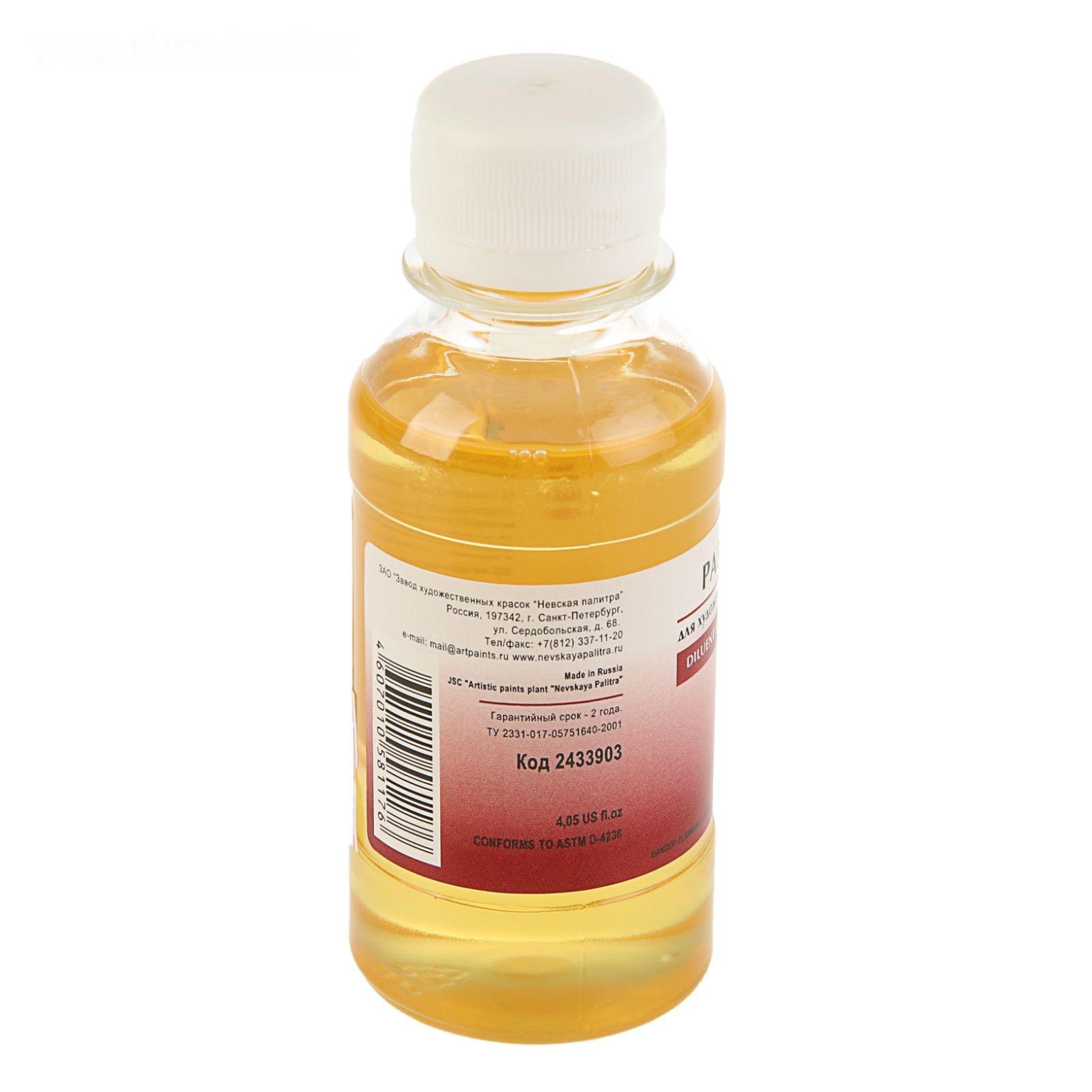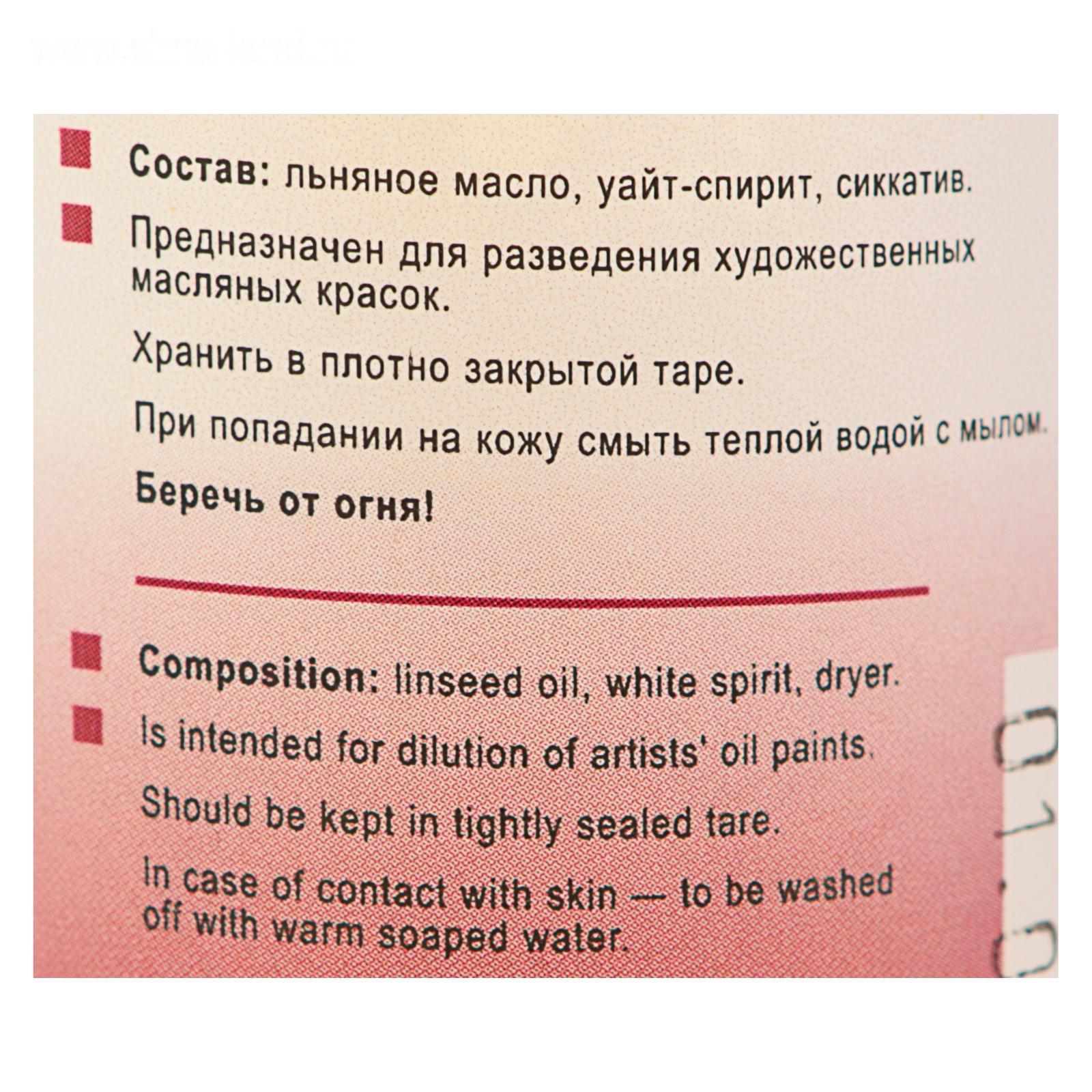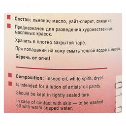 Разбавитель масляный Невская палитра. Применяется для разведение масляных, алкидных красок и для смывания красок с полотен, палитр, кистей. Состав: льняное масло, уайт-спирит, сиккатив.