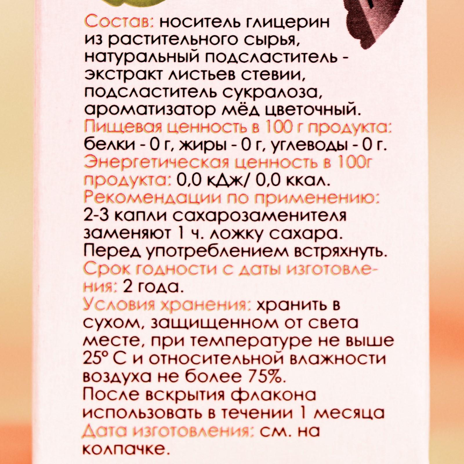 Состав: вода подготовленная, подсластитель сукралоза (Е955), подсластитель стевиозид (Е960), ароматизатор «Мёд», консервант - сорбиновая кислота.