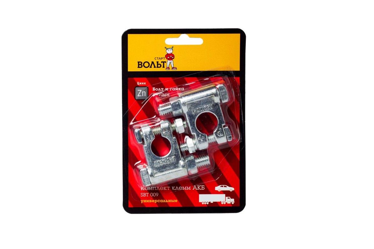 Клеммы АКБ СТАРТВОЛЬТ SBT 009 к-т цинк болт и гайка 10мм Комплект клемм АКБ цинк, болт и гайка 10мм (SBT 009)