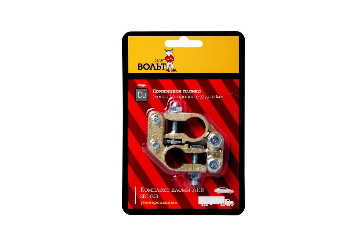 Клеммы АКБ СТАРТВОЛЬТ SBT 008 к-т медь прижимная планка левое - правое + до 50мм Комплект клемм АКБ медь, прижимная планка (левое (-), правое (+)) до 50 мм (SBT 008)