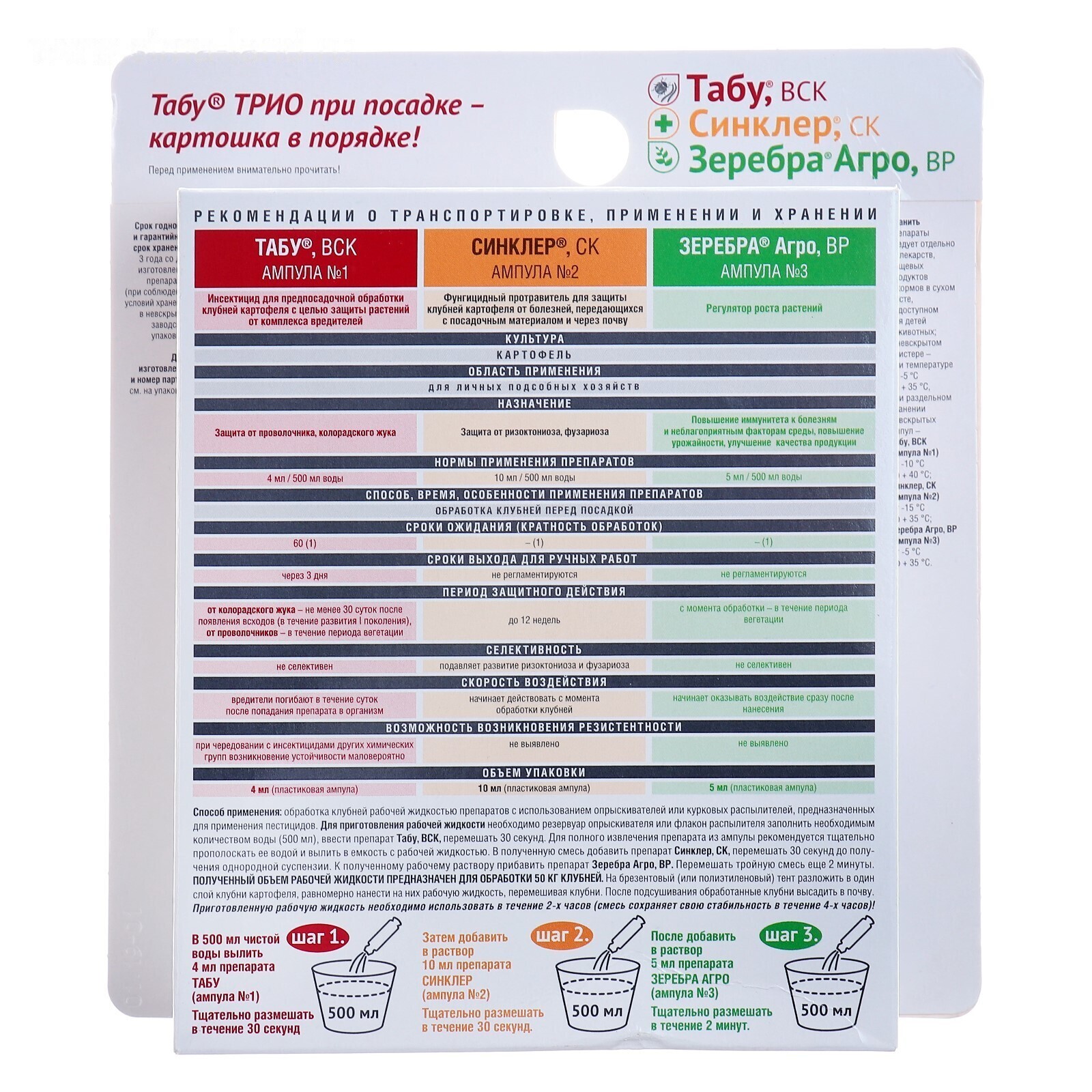 Табу ТРИО протравитель картофеля ( 3 ампулы) используется в виде баковой смеси из трех препаратов.