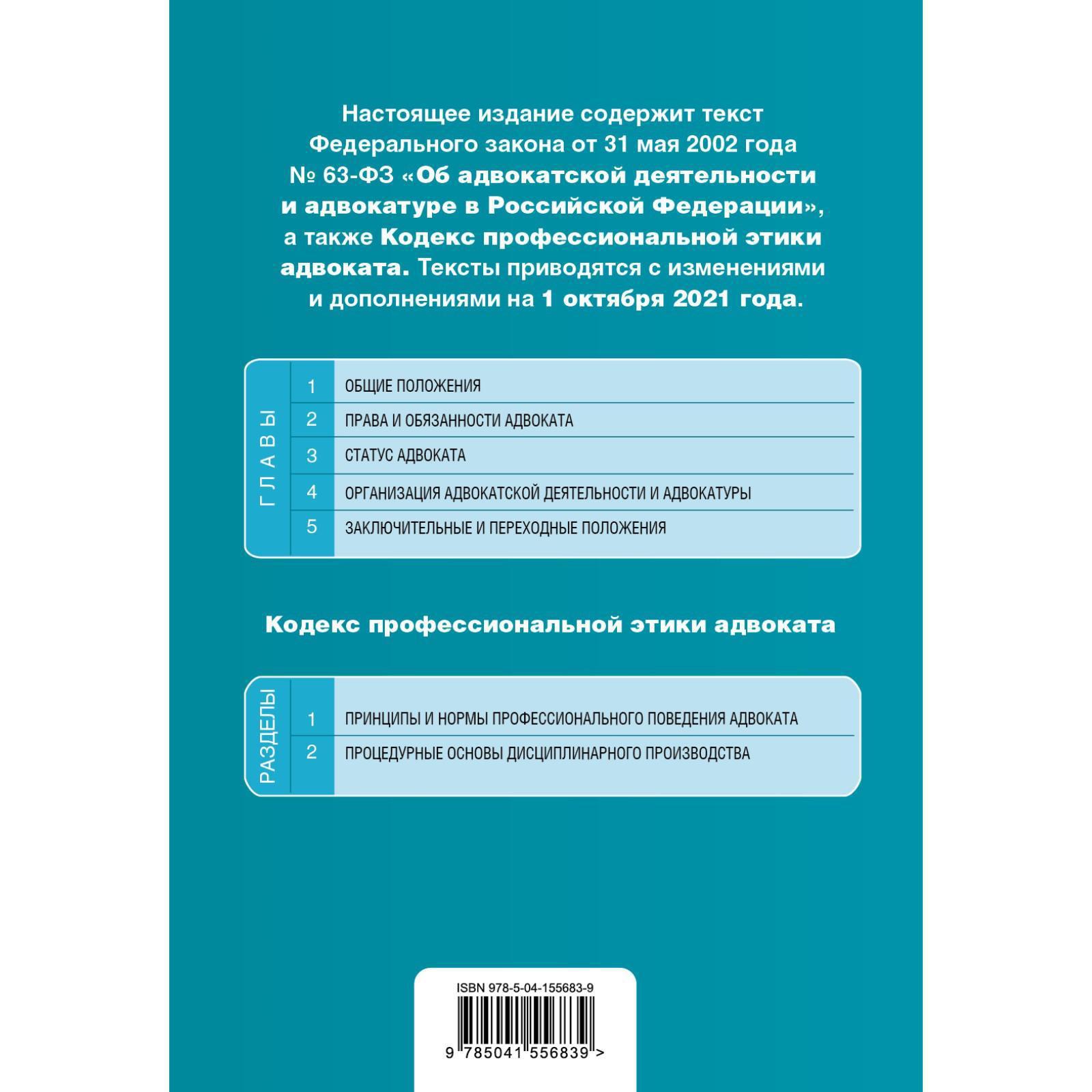 Настоящее издание содержит текст Федерального закона от 31 мая 2002 года № 63-ФЗ «Об адвокатской деятельности и адвокатуре в Российской Федерации», а также «Кодекс профессиональной этики адвоката». Тексты приводятся с изменениями и дополнениями на 2021 год. Если есть изменения, вступающие в силу позднее, то вместе с редакцией нормы, действующей на эту дату, приводится норма в новой редакции и указывается дата, с которой она вступает в силу.