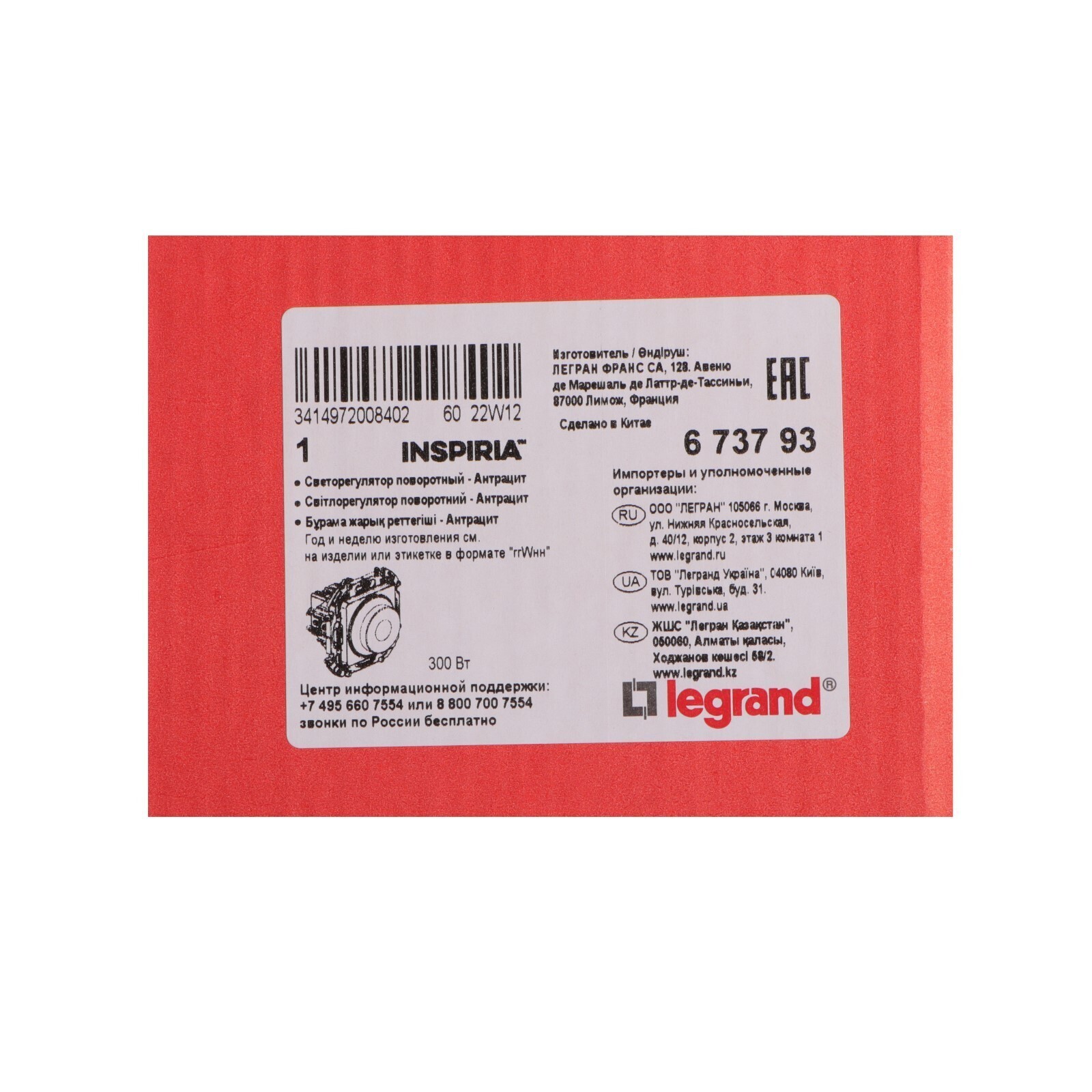Светорегулятор поворотный Legrand INSPIRIA, без нейтрали, 300 Вт, Антрацит