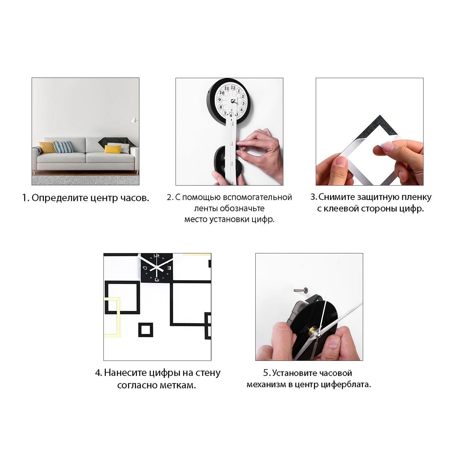 Создавайте часы в собственном стиле, проявляйте изобретательность и креативность. Не обязательно располагать числа по кругу — придайте аксессуару необычную форму, поменяйте диаметр циферблата, используйте не все элементы. Комплектующие легко клеятся на стену и без труда снимаются.