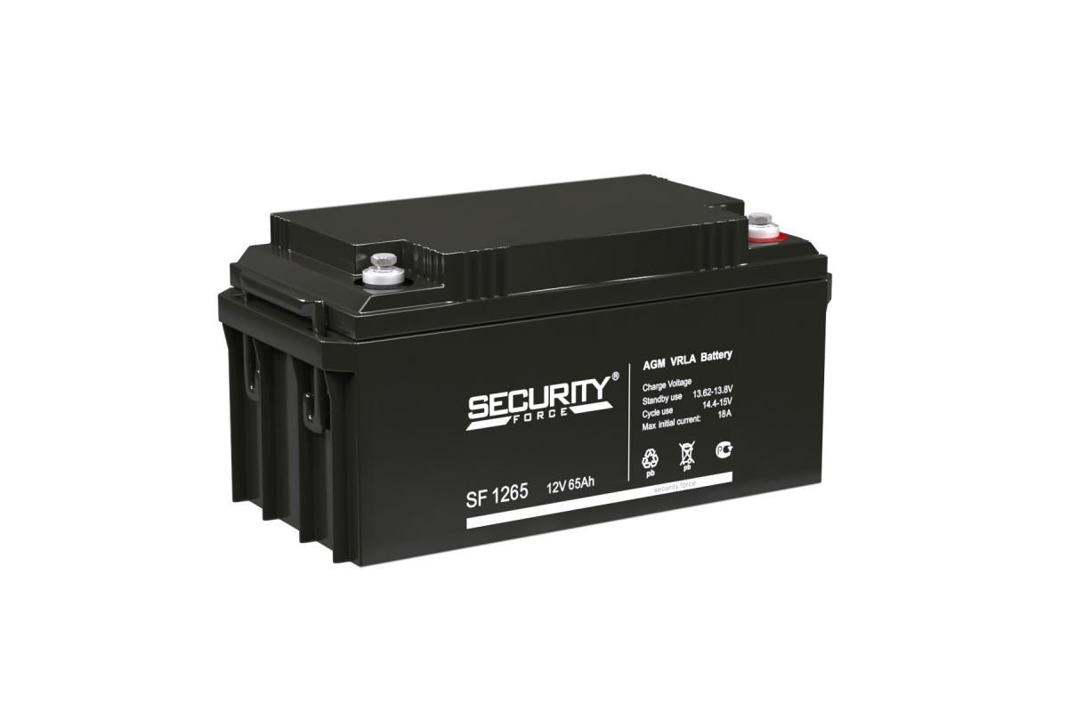 Аккумулятор Security Force SF 1265 благодаря своим характеристикам (напряжение 12 В, ёмкость 65 Ач) применяется в: охранных и пожарных системах, кассовых аппаратах, аварийном освещении. Корпус из ABS пластмассы надёжно запаян, это исключает протекание электролита и позволяет газам рекомбинировать. На крышке располагается односторонний клапан избыточного давления. Security Force SF 1265 работает как в циклическом, так и в буферном режиме. Благодаря стекловолоконным сепараторам (AGM) жидкий электролит удерживается в неподвижном состоянии. Срок службы аккумулятора 8 лет. Дата производства аккумулятора Security Force SF 1265 указана на крышке в виде символьного кода.