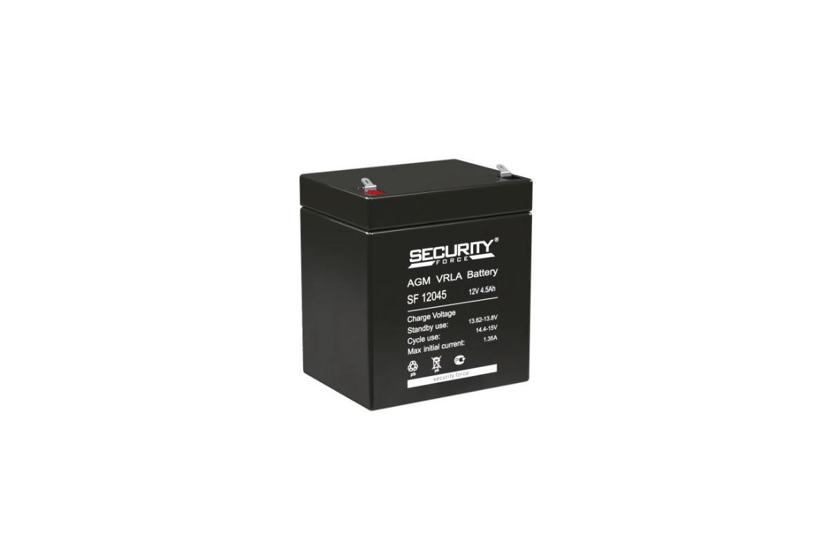 Аккумулятор Security Force SF 12045 благодаря своим характеристикам (напряжение 12 В, ёмкость 4.5 Ач) применяется в: охранных и пожарных системах, кассовых аппаратах, аварийном освещении. Корпус из ABS пластмассы надёжно запаян, это исключает протекание электролита и позволяет газам рекомбинировать. На крышке располагается односторонний клапан избыточного давления. Security Force SF 12045 работает как в циклическом, так и в буферном режиме. Благодаря стекловолоконным сепараторам (AGM) жидкий электролит удерживается в неподвижном состоянии. Срок службы аккумулятора 5 лет. Дата производства аккумулятора Security Force SF 12045 указана на крышке в виде символьного кода.