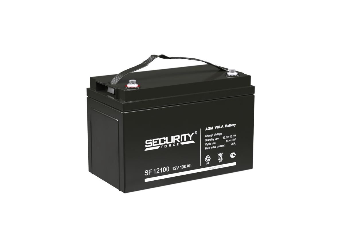 Аккумулятор Security Force SF 12100 благодаря своим характеристикам (напряжение 12 В, ёмкость 100 Ач) применяется в: охранных и пожарных системах, кассовых аппаратах, аварийном освещении. Корпус из ABS пластмассы надёжно запаян, это исключает протекание электролита и позволяет газам рекомбинировать. На крышке располагается односторонний клапан избыточного давления. Security Force SF 12100 работает как в циклическом, так и в буферном режиме. Благодаря стекловолоконным сепараторам (AGM) жидкий электролит удерживается в неподвижном состоянии. Срок службы аккумулятора 8 лет. Дата производства аккумулятора Security Force SF 12100 указана на крышке в виде символьного кода.
