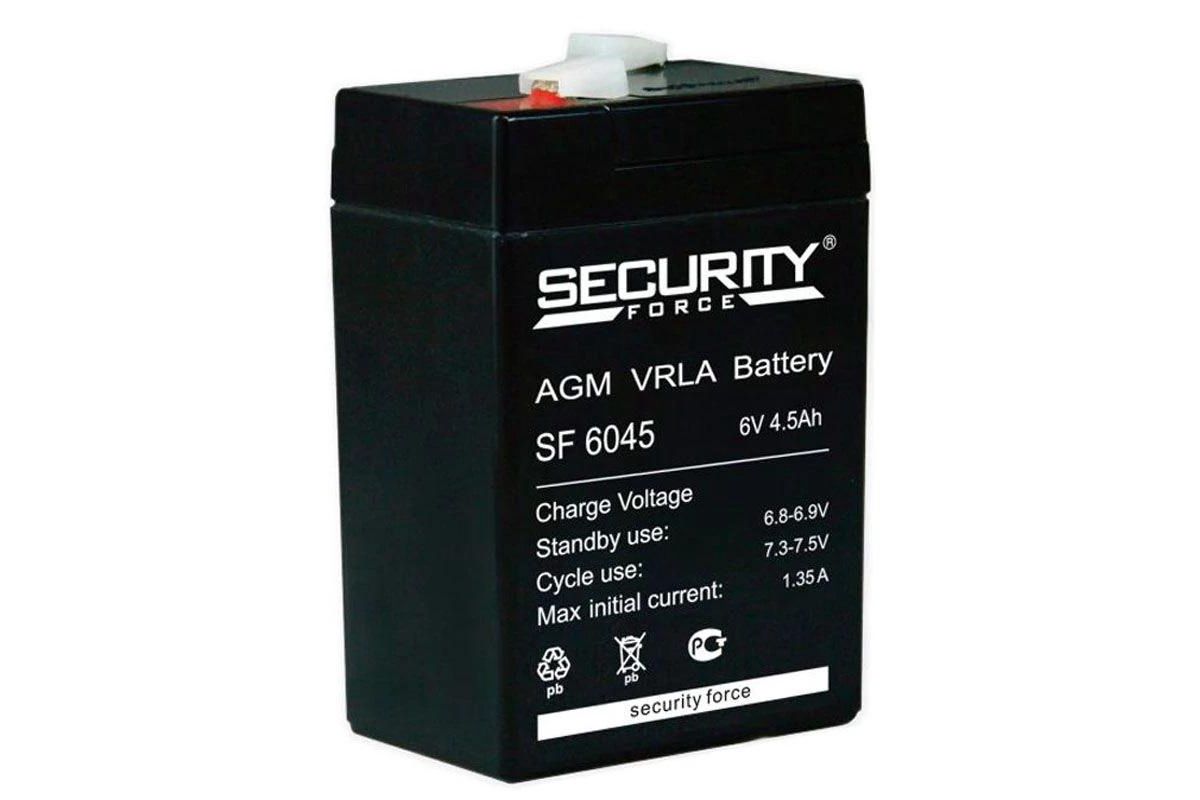 Аккумулятор Security Force SF 6045 благодаря своим характеристикам (напряжение 6 В, ёмкость 4.5 Ач) применяется в: охранных и пожарных системах, кассовых аппаратах, аварийном освещении. Корпус из ABS пластмассы надёжно запаян, это исключает протекание электролита и позволяет газам рекомбинировать. На крышке располагается односторонний клапан избыточного давления. Security Force SF 6045 работает как в циклическом, так и в буферном режиме. Благодаря стекловолоконным сепараторам (AGM) жидкий электролит удерживается в неподвижном состоянии. Срок службы аккумулятора 5 лет. Дата производства аккумулятора Security Force SF 6045 указана на крышке в виде символьного кода.