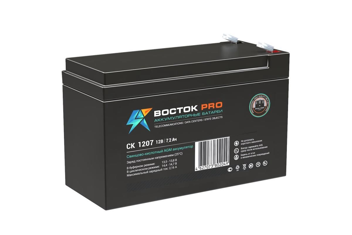 Свинцово-кислотный аккумулятор Восток СК-1207 (ёмкость 7.2 Ач; напряжение 12 В) обладает высокими разрядными и эксплуатационными характеристиками. Высокое качество батарей позволяет использовать их в ИБП, системах отопления/водоснабжения, резервных системах энергоснабжения. Полностью герметичный корпус из ABS-пластика позволяет газам рекомбинировать внутри аккумулятора, это делает Восток СК1207 необслуживаемым — доливать воду не требуется. Срок службы батареи в циклическом режиме при правильной эксплуатации достигает 1200 циклов, в буферном — 5 лет. Дата производства аккумулятора Восток СК-1207 указана на крышке в виде символьного кода.