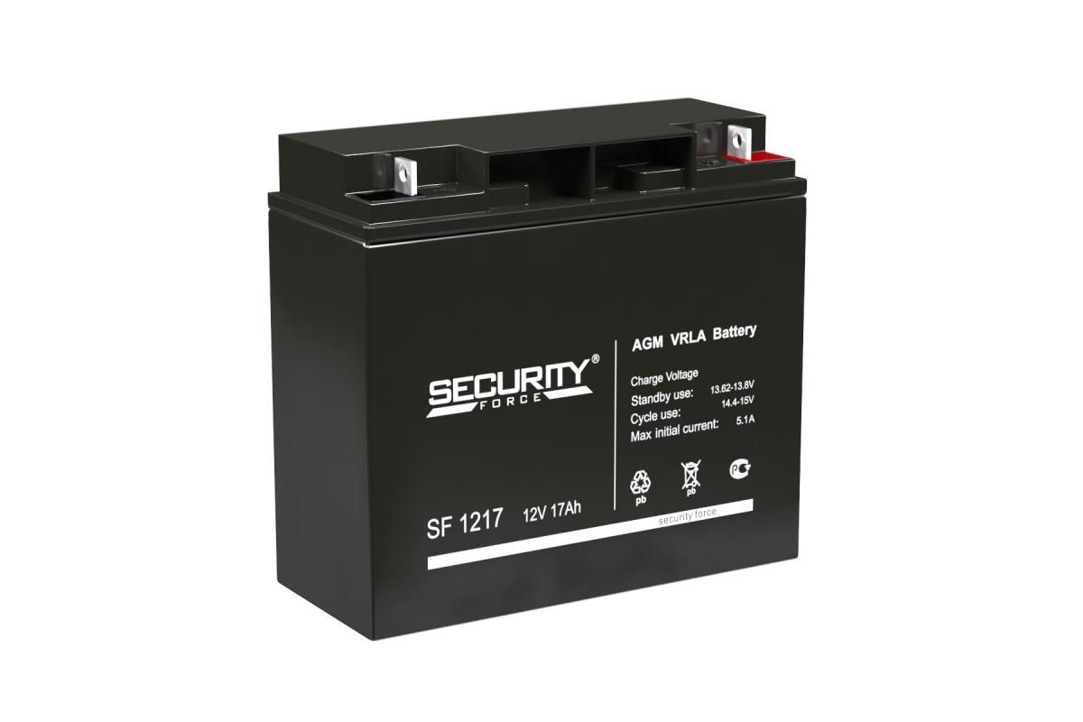 Аккумулятор Security Force SF 1217 благодаря своим характеристикам (напряжение 12 В, ёмкость 17 Ач) применяется в: охранных и пожарных системах, кассовых аппаратах, аварийном освещении. Корпус из ABS пластмассы надёжно запаян, это исключает протекание электролита и позволяет газам рекомбинировать. На крышке располагается односторонний клапан избыточного давления. Security Force SF 1217 работает как в циклическом, так и в буферном режиме. Благодаря стекловолоконным сепараторам (AGM) жидкий электролит удерживается в неподвижном состоянии. Срок службы аккумулятора 5 лет. Дата производства аккумулятора Security Force SF 1217 указана на крышке в виде символьного кода.