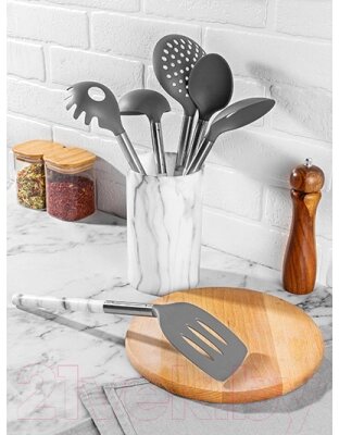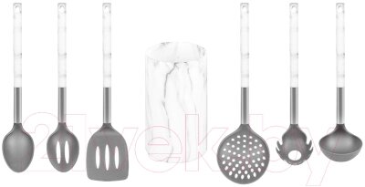 • В комплекте подставка, ложка для спагетти, лопатка, шумовка, половник, ложка-дуршлаг, ложка кулинарная