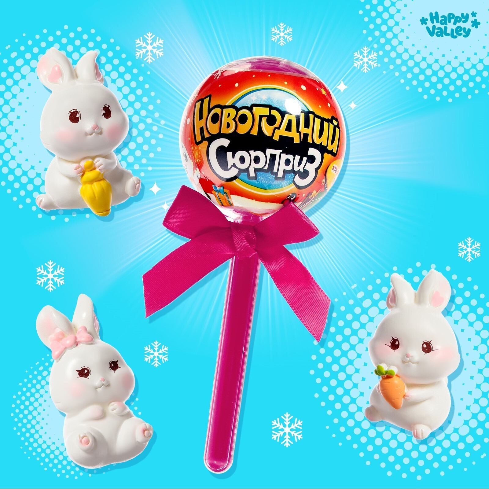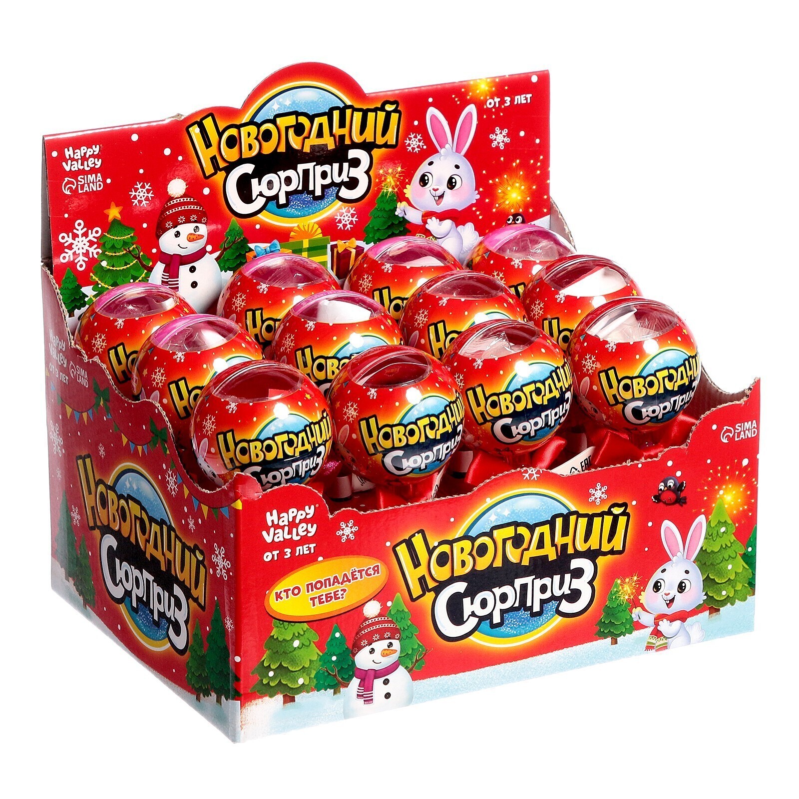 В каждом шаре на палочке спрятались маленькие зайчата. Какие достанутся вам, останется секретом, пока не откроете шар. А ещё малыши найдут внутри яркие новогодние наклейки. Соберите их всех.