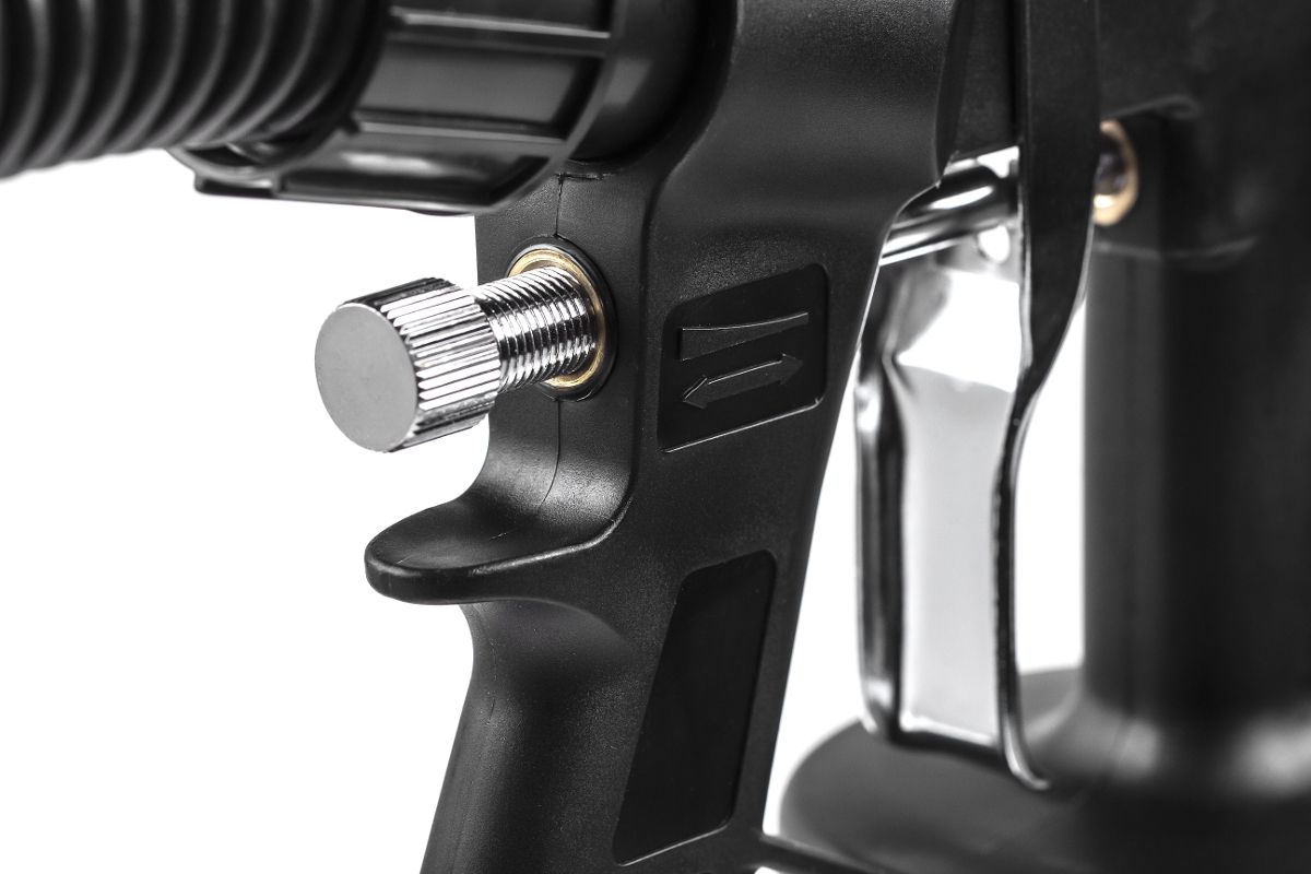 Электрический краскопульт Hammer PRZ500B системы HVLP обеспечивает точное нанесение материала при сниженном количестве тумана, образующегося в процессе окраски, что приводит к экономии краски на 30-40%. Снижение потерь на туманообразование и равномерность нанесения достигаются за счёт того, что воздух под давлением, проходя через сопло, разбивает краску на мелкодисперсные частицы и рассеивает их в форме факела. Разделённый компрессор и распылитель снижают вес, приходящийся на руки оператора, что делает его более удобным при продолжительных работах (наплечный ремень для удобства эксплуатации входит в комплект постаки). Прозрачный бачок обеспечивает визуальный контроль уровня наполнения. Регулировка аэрозольного факела в 3 пространственных положениях способствует точной настройке в зависимости от формы окрашиваемой поверхности. Максимальный расход рабочей жидкости - 800 мл/мин. Встроенный компрессор позволяет использовать лакокрасочные материалы различной вязкости. Форсунка и головка краскопульта легко и быстро отсоединяются от основного корпуса и очищаются отдельно. Прецизионное изготовление сопла и иглы из металла гарантирует прочность и устраняет подтекание краски при повторном использовании (защита от подтёков). Эластичный армированный шланг обладает большим запасом прочности. Длина шнура 1,5 метра.