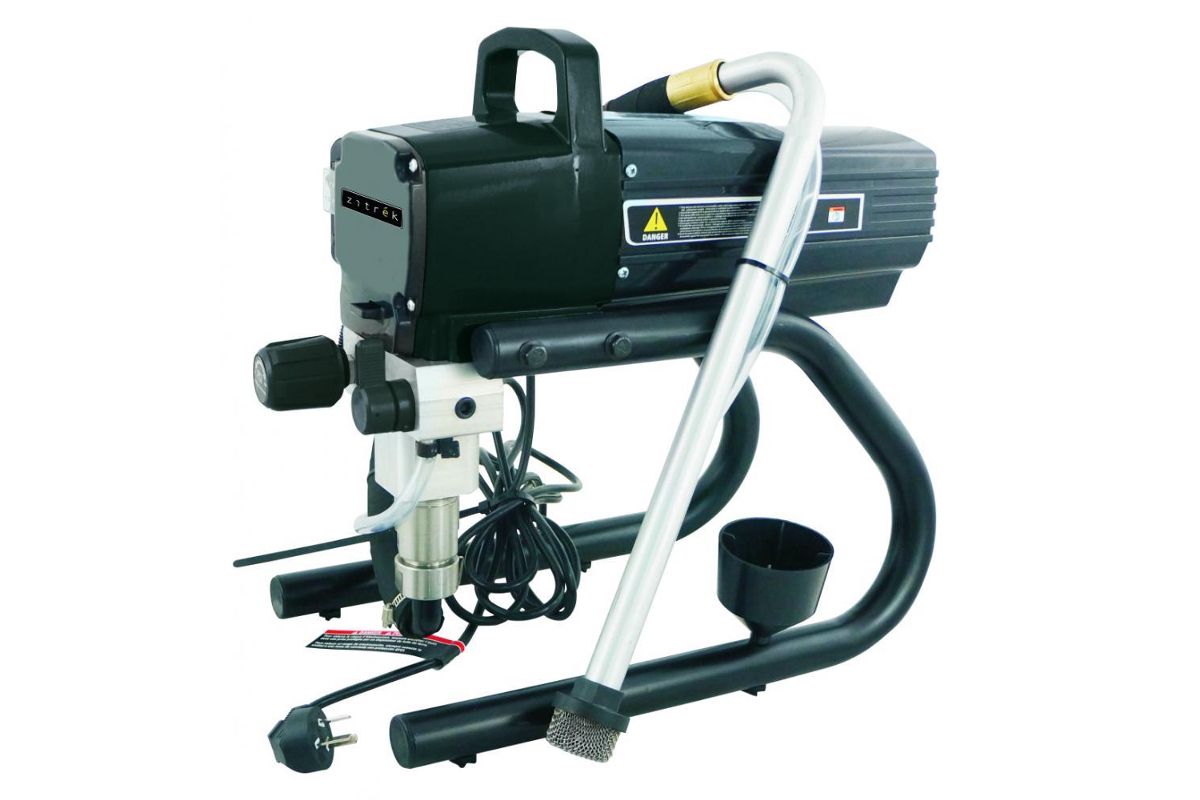 Поршневой безвоздушный окрасочный аппарат Zitrek Z440 высокого давления для проведения покрасочных работ на строительной площадке. Окрасочный аппарат работает от сети 220V. Краску засасывает из ведра и подаёт её по шлангу на краскопульт для распыления.