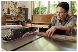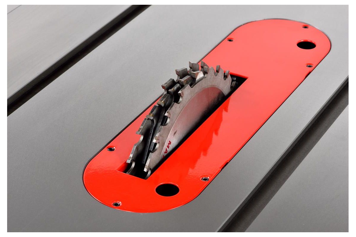 Способен кроме распиловки выполнять задачи по фрезерованию: спец. конструкция шпинделя, зажимных фланцев и сменные вставки пильного стола позволяют использовать в работе пазовальные диски Dado.