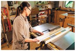 Упор перемещают вдоль специальной направляющей, что позволяет распиливать заготовки значительной ширины, даже большей чем размер стола с расширителями.