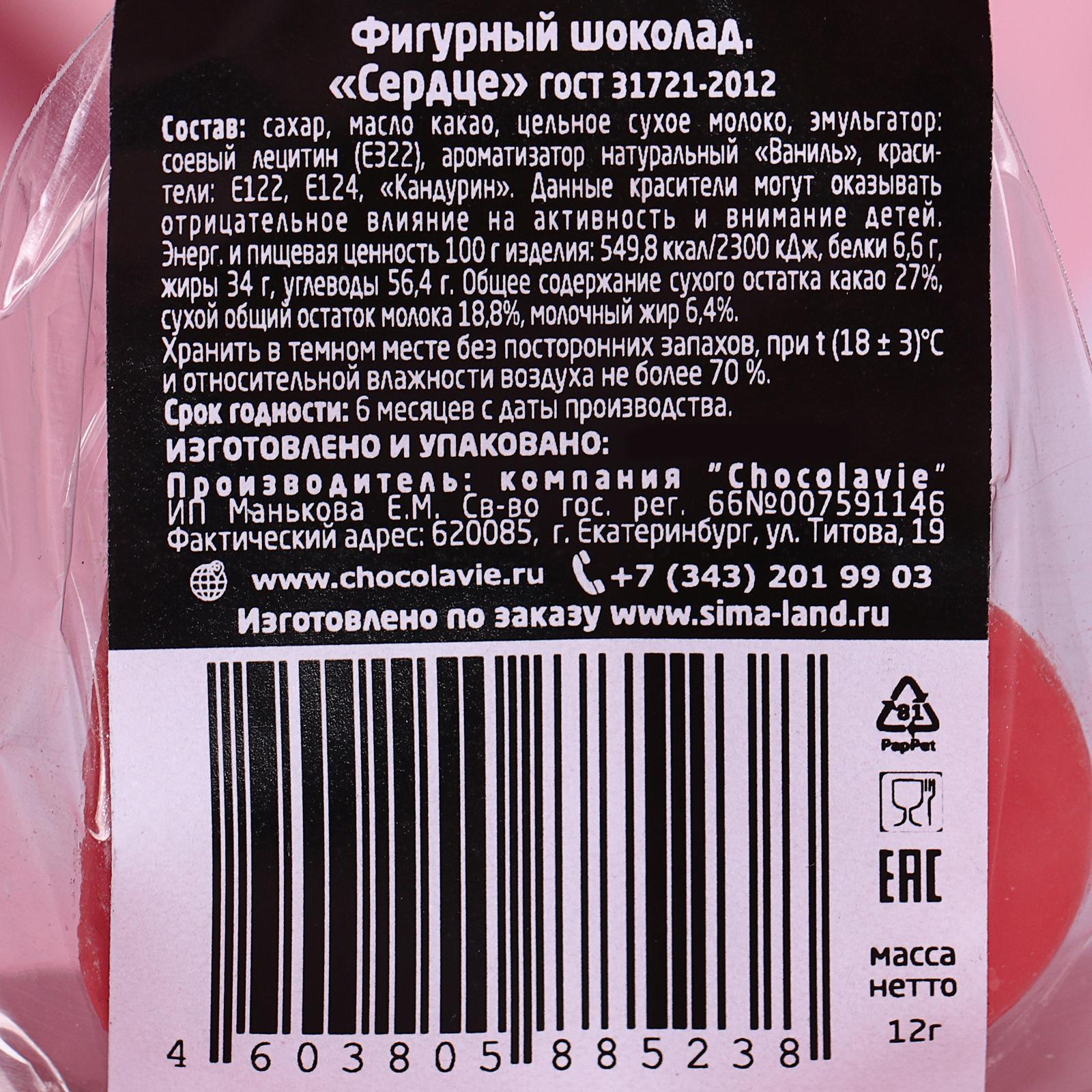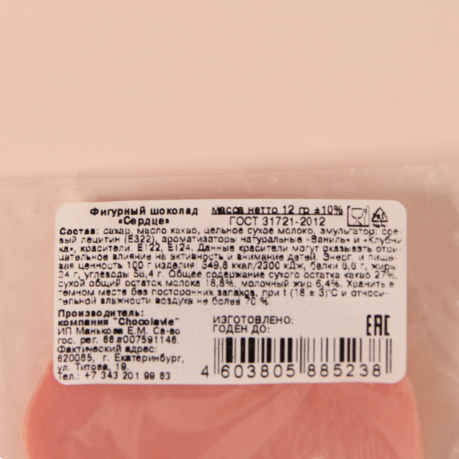 Шоколад фигурный «Сердце», рубиновый, 12 г