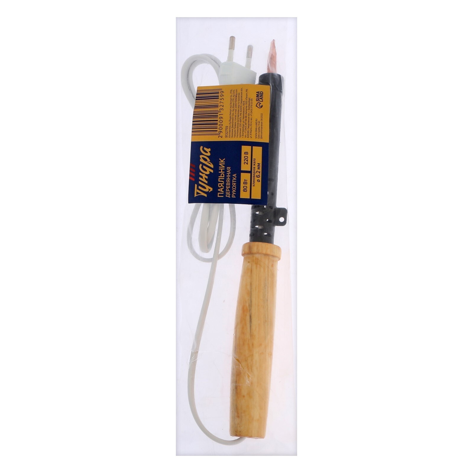 Паяльник ТУНДРА, ЭПСН, деревянная рукоятка, клиновидное жало d=6.2 мм, 80 Вт, 220 В