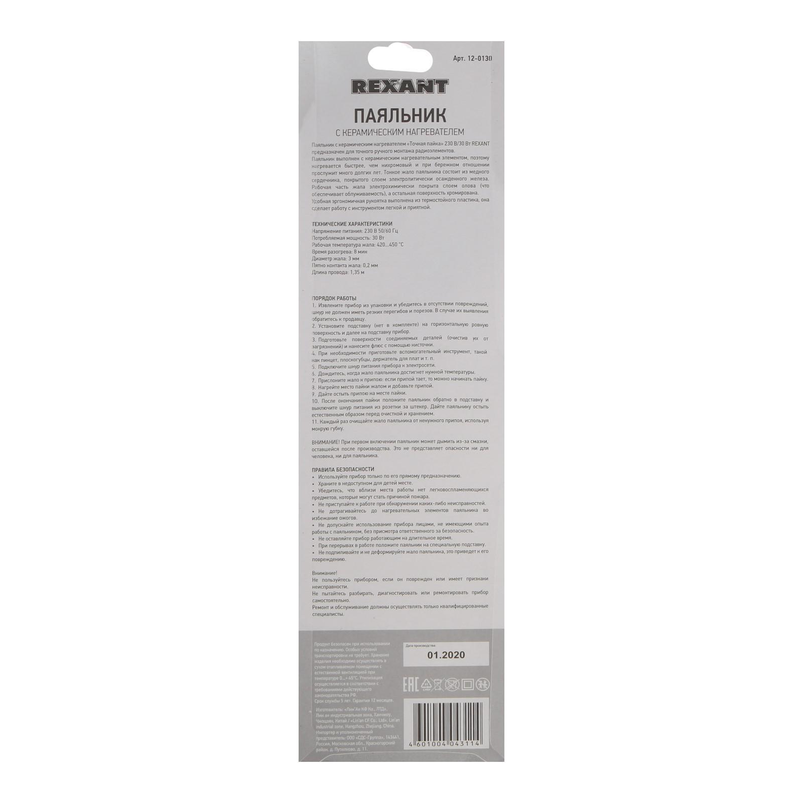Паяльник REXANT 12-0130, «Точная пайка», 220 В, 30 Вт, тонкое жало