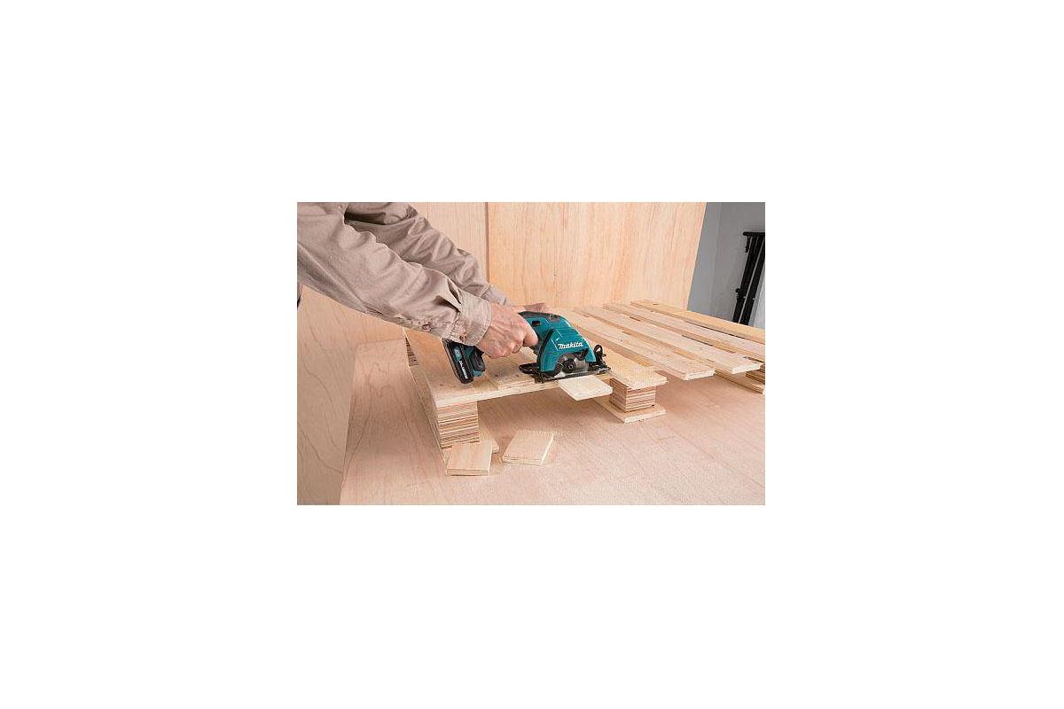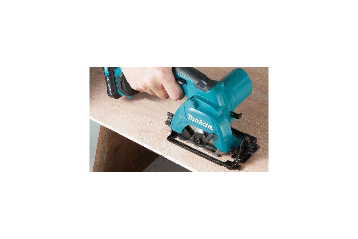 В состав набора входят: Пила циркулярная MAKITA HS301DWAE 10.8В 2х2Ач Li-ion 1500об\м диск-ф85мм рез-25.5мм 1.6кг чем, Рулетка MAKITA PGC-80520
