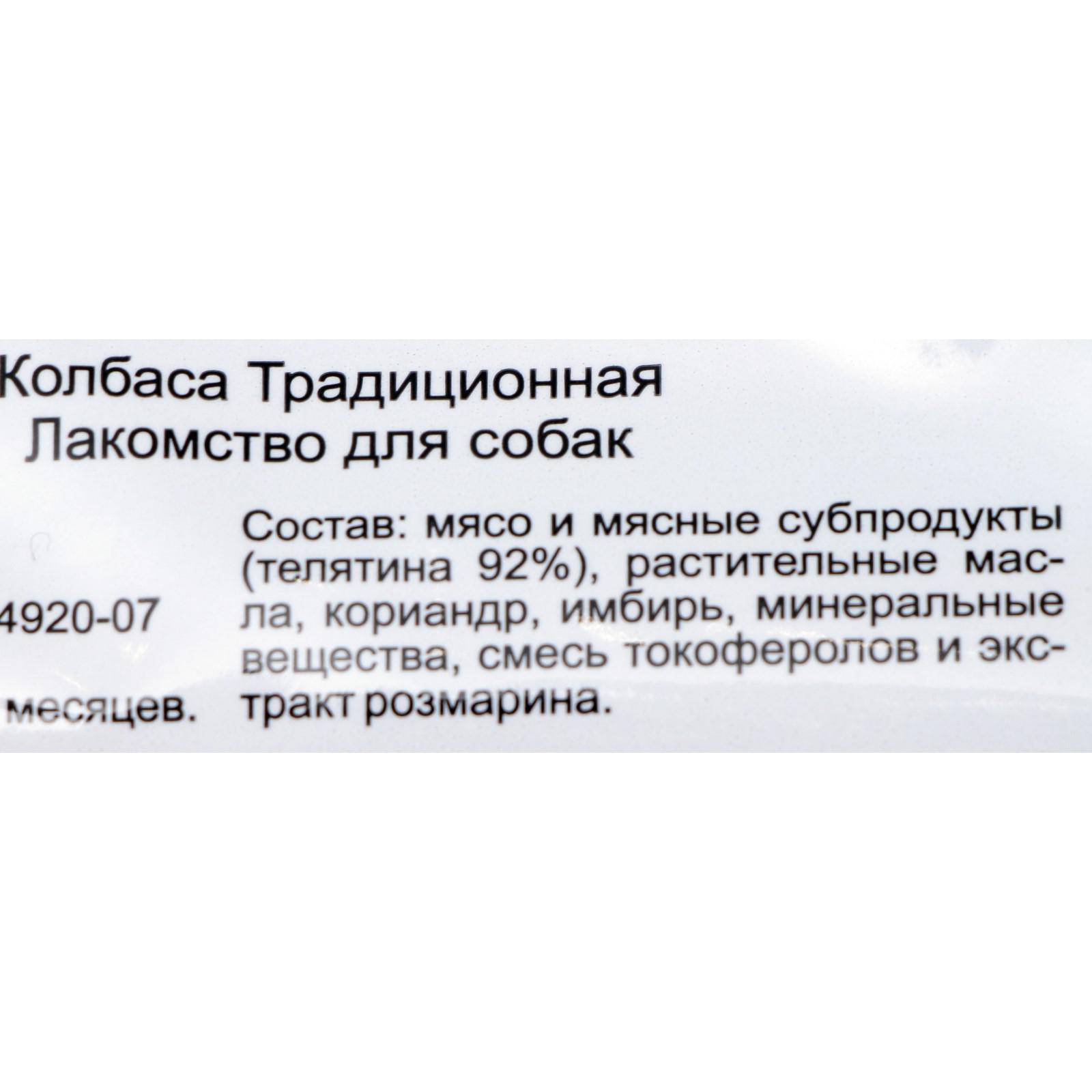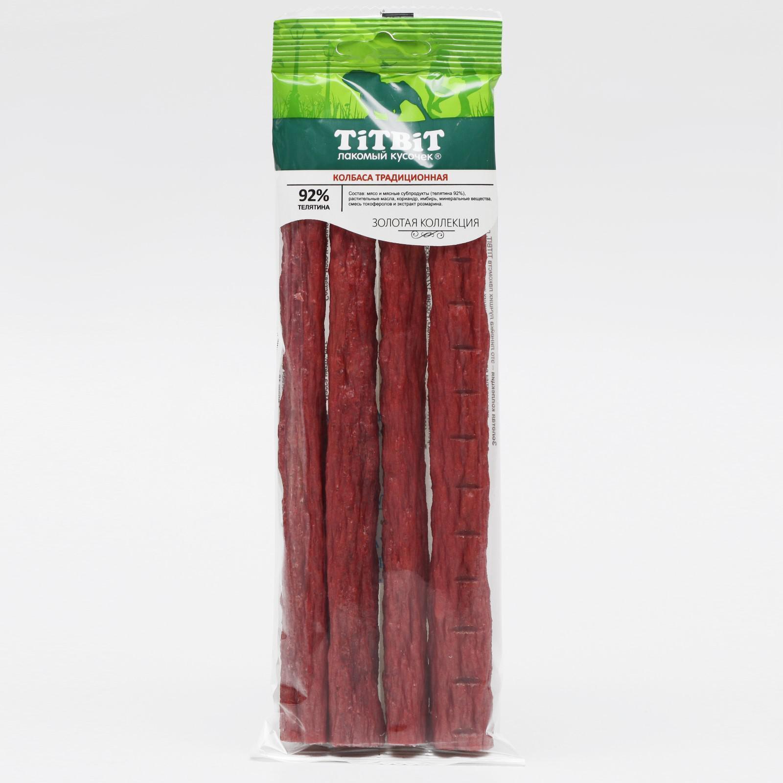 Лакомства Золотая коллекция TiTBiT– это линейка мясных лакомств, разработанных при участии владельцев домашних животных и их питомцев. Колбаски Традиционные приготовлены по классическому рецепту из телятины, дополнены щепоткой кориандра и имбиря, придающих нежному вкусу изысканность. Это полезное и натуральное лакомство содержит полезные витамины группы В, РР, минеральные вещества Со(кобальт), Zn(цинк), Fe(железо).