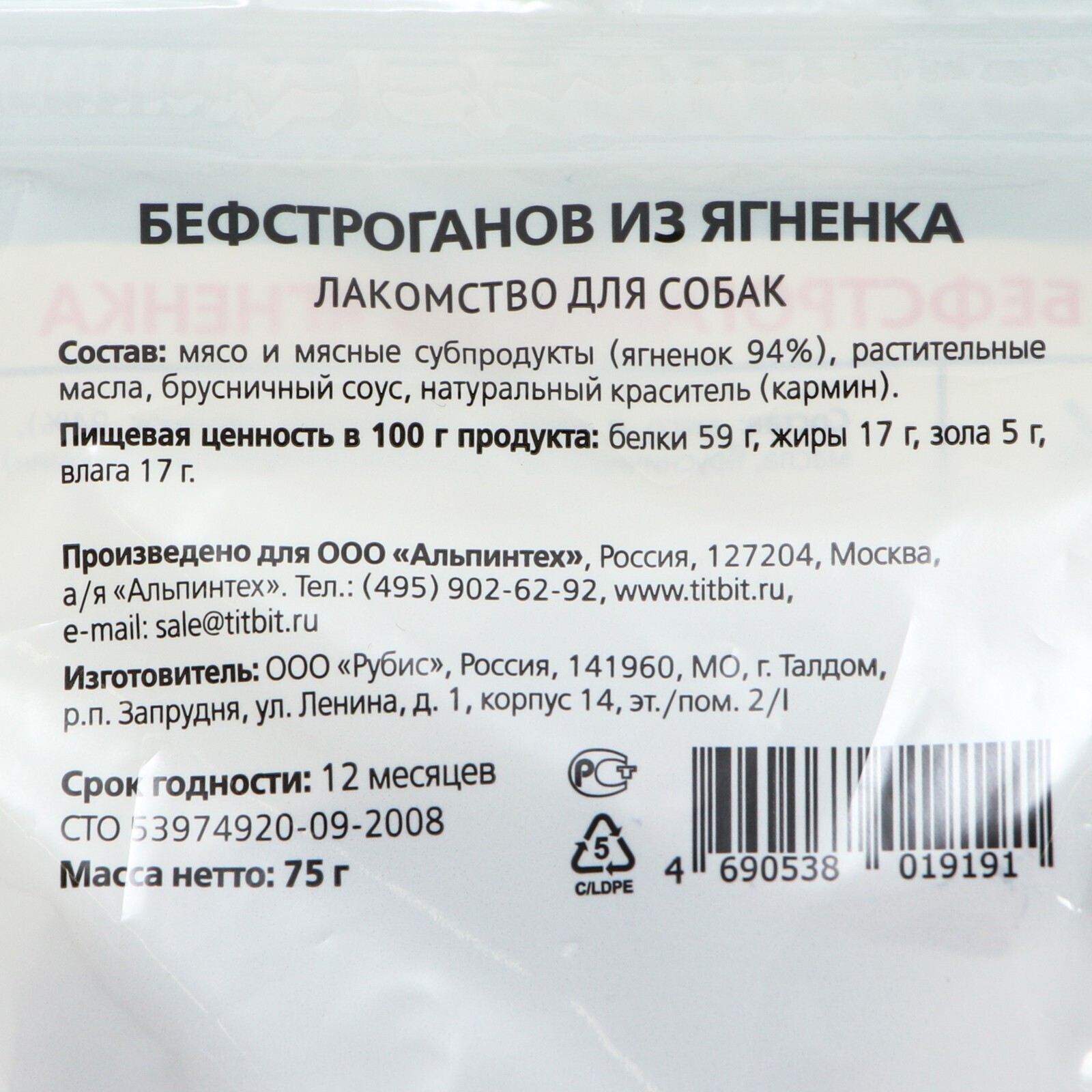 Лакомство для собак Titbit Бефстроганов из ягненка "Золотая коллекция", 75 г