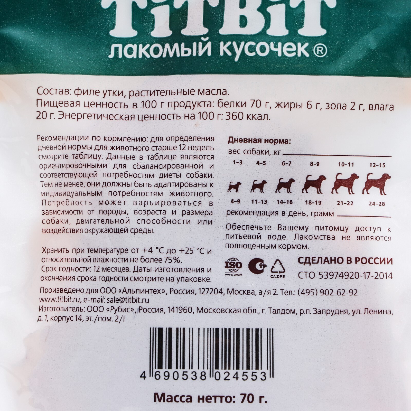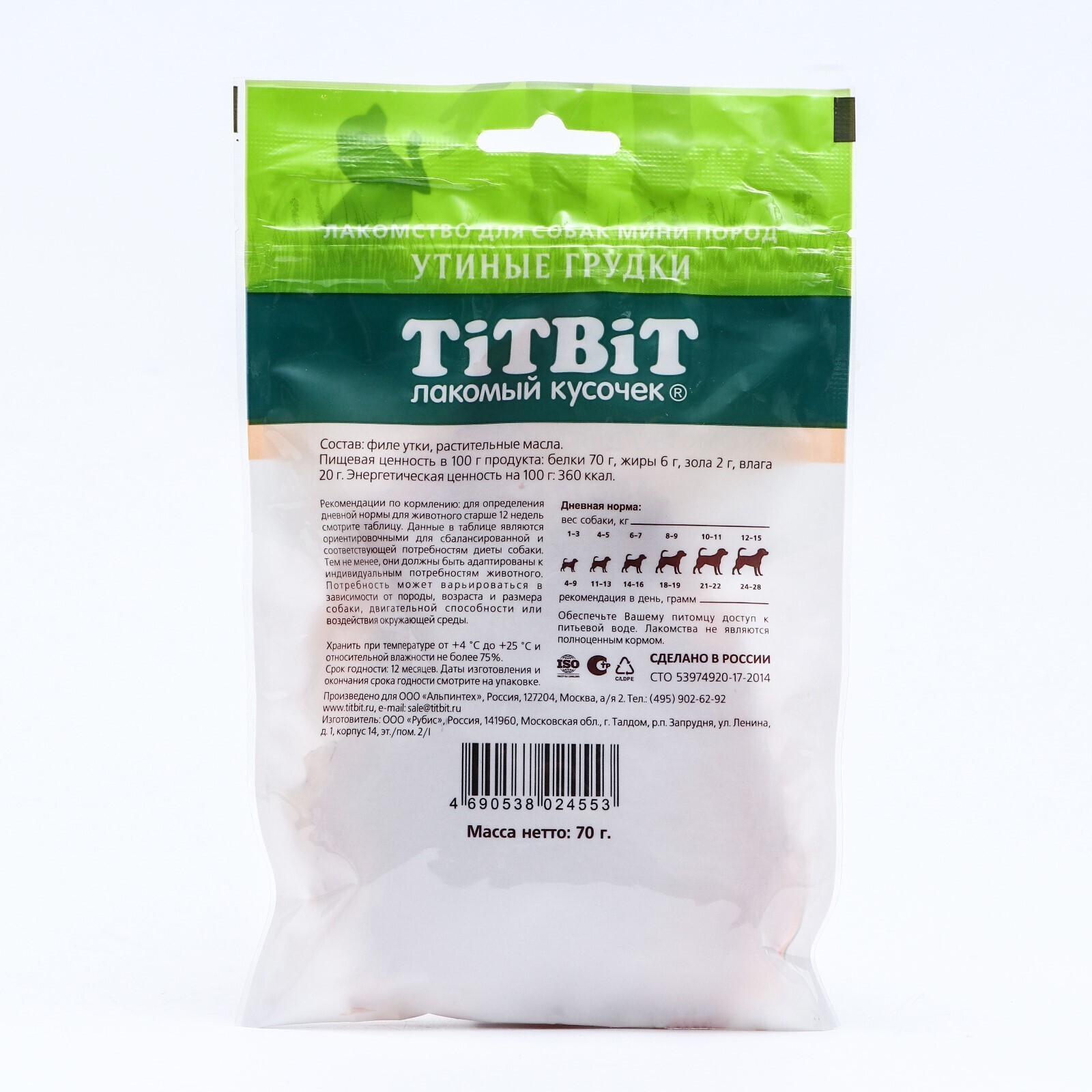 Лакомство для собак мини-пород Titbit утиные грудки 70 г