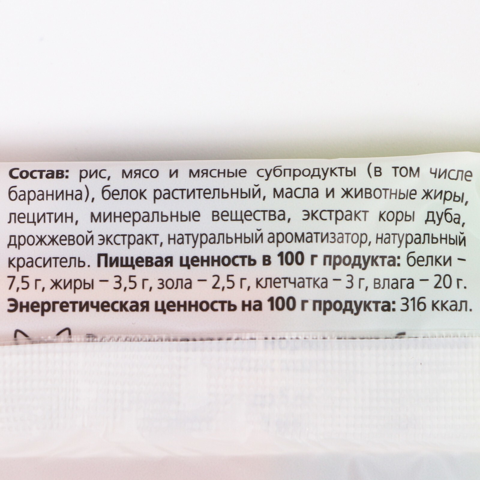 Состав: рис, мясо и мясные субпродукты (в том числе баранина), белок растительный, масла и животные жиры, лецитин, минеральные вещества, экстракт коры дуба, дрожжевой экстракт, натуральный ароматизатор, натуральный краситель.