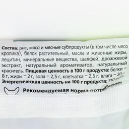 Состав: рис, мясо и мясные субпродукты (в том числе мясо кролика), белок растительный, масла и животные жиры, лецитин, минеральные вещества, шалфей, дрожжевой экстракт, натуральный ароматизатор, натуральный краситель.