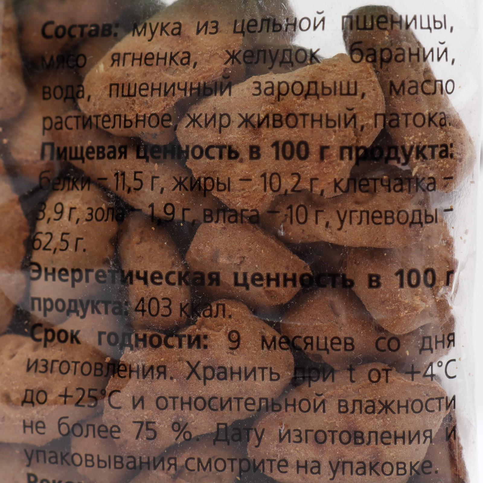 Состав: мука из цельной пшеницы, мясо ягненка, желудок бараний, вода, пшеничный зародыш, масло растительное, жир животный, патока.