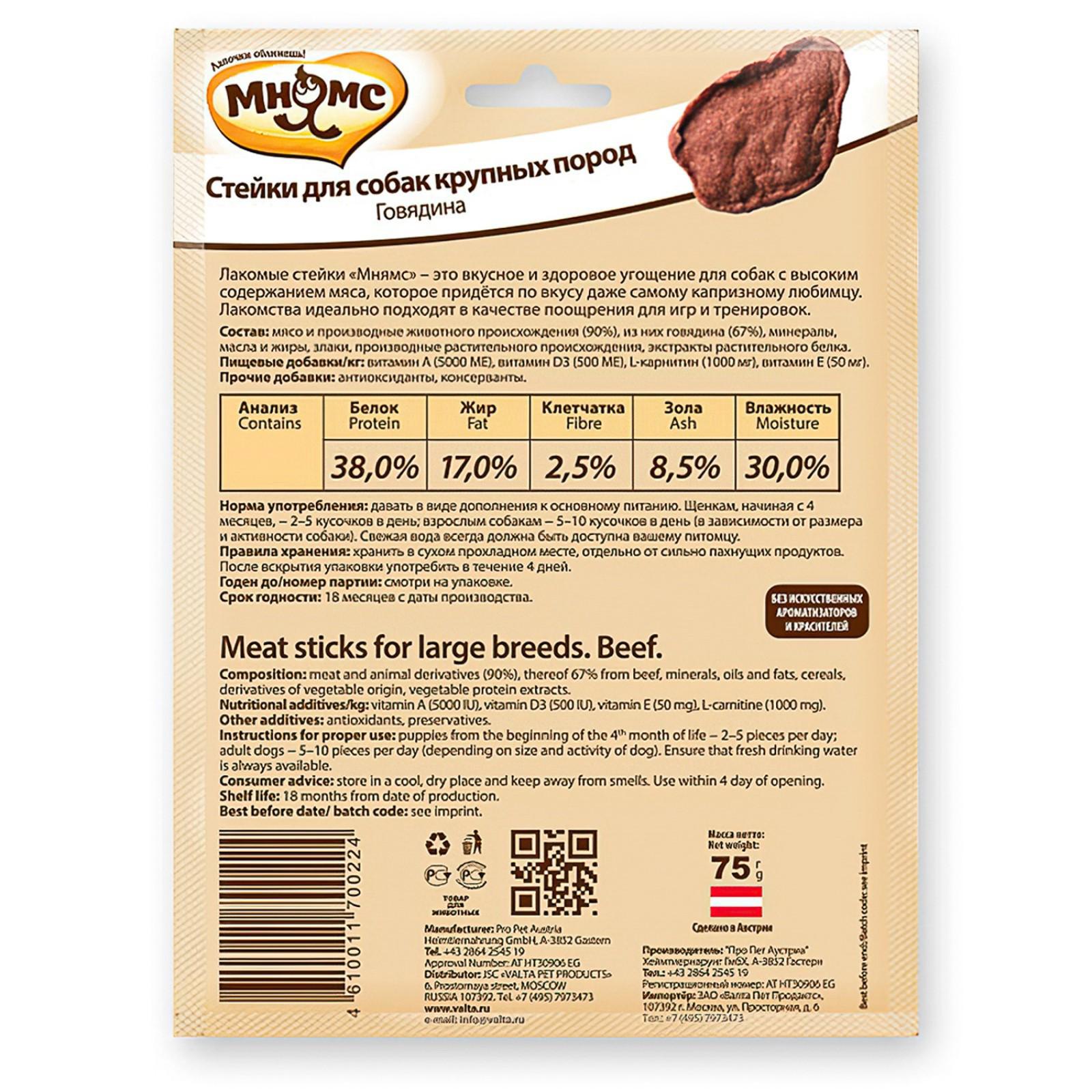 Лакомые стейки «Мнямс» - это вкусное и здоровое угощение для собак с большим содержанием мяса, которое придется по вкусу даже самому капризному любимцу.