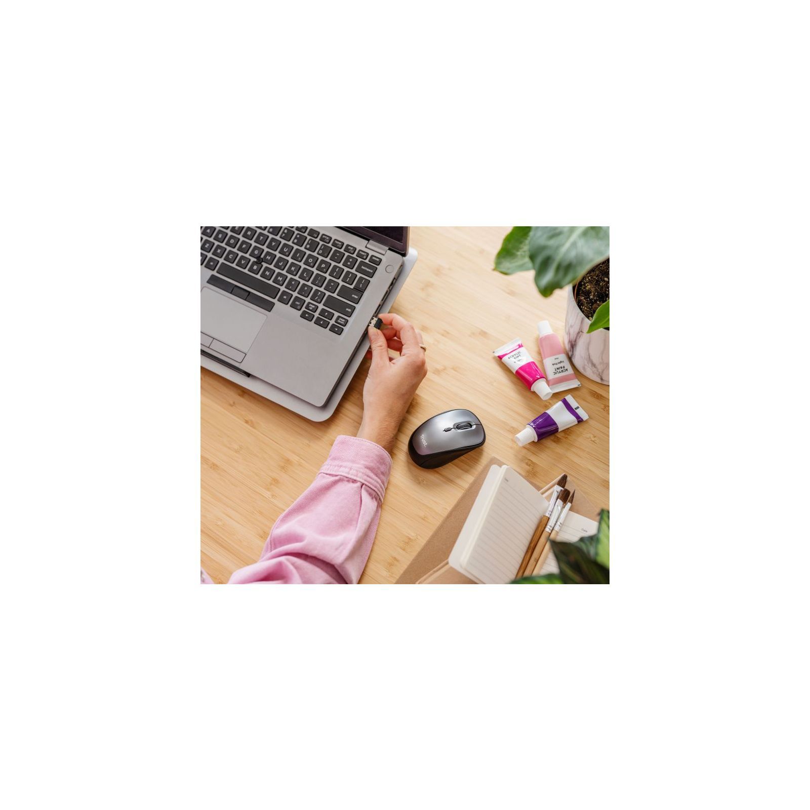 Безшумна бездротова миша. Безшумні кнопки для тихої роботи. Екологічний дизайн на 83% виготовлено із перероблених матеріалів. Повністю бездротовий пристрій – термін служби акумулятора до 12 місяців. Кнопка вибору швидкості (800/1600 пікселів на дюйм) для налагодженого керування. Гумове покриття з боків забезпечує ідеальне захоплення та комфортне керування. Кнопка увімкнення/вимкнення для збільшення часу роботи від акумулятора.