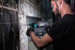 Аккумуляторный трехрежимный перфоратор TD18DC обладает энергией удара 1,9 Дж, что обеспечивает эффективную работу в режиме отбойного молотка, а также максимально быстрое прохождение бура в материале в режиме сверления с ударом. В конструкции модели предусмотрена функция реверса, с помощью которой можно легко извлечь бур или сверло из отверстия любой глубины. Удобство эксплуатации обеспечивает эргономичный корпус с эластомерными накладками. Для максимального комфорта в работе перфоратор оснащен антивибрационной дополнительной рукояткой с встроенным глубиновмером и подсветкой рабочей зоны.