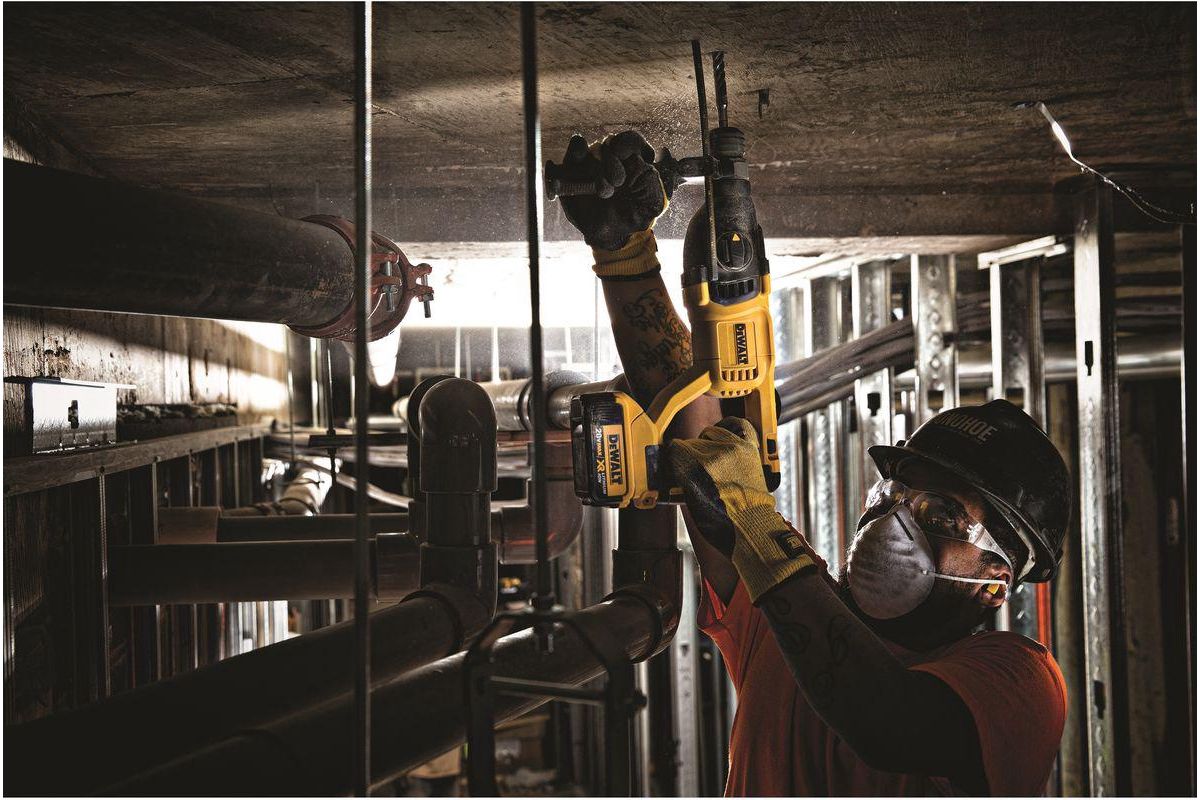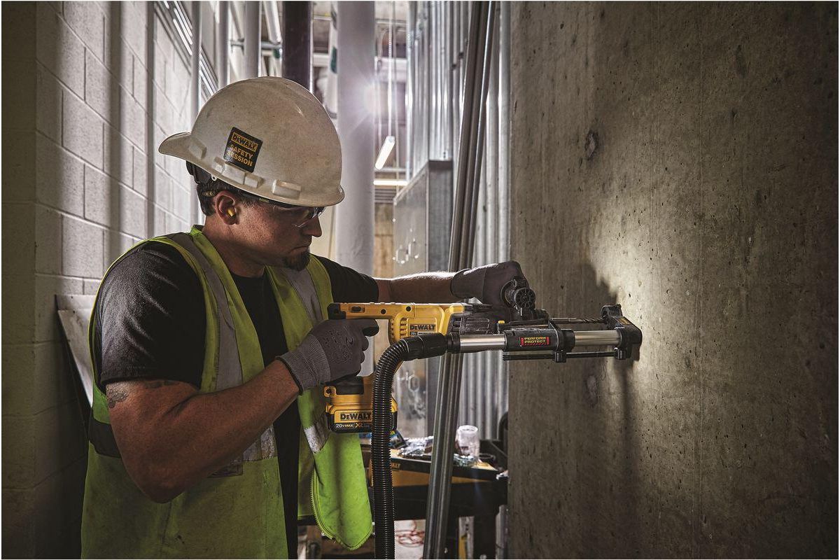 DEWALT DCH133NXJ – лёгкий аккумуляторный перфоратор. Весит 2,3 кг. Сила удара 2,6 Дж. Работает от батареи 18 В. Аккумулятор и ЗУ не входят в комплект. 3 режима работы: сверление с ударом и без, долбление. Подходит для бурения камня, бетона, кирпича, в безударном режиме сверлит дерево и металл.