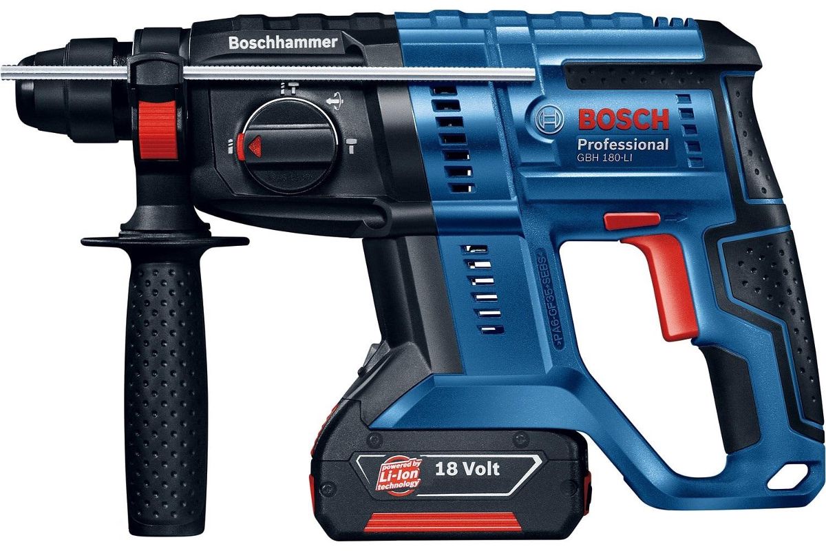 BOSCH GBH 180-LI – профессиональный аккумуляторный перфоратор с вертикальным расположением двигателя. Максимальная сила удара – 1,7 Дж. Диаметр сверления в дереве – 30 мм, в металле – 13 мм, коронкой в бетоне – 68 мм. Инструмент поставляется с двумя аккумуляторами в комплекте.