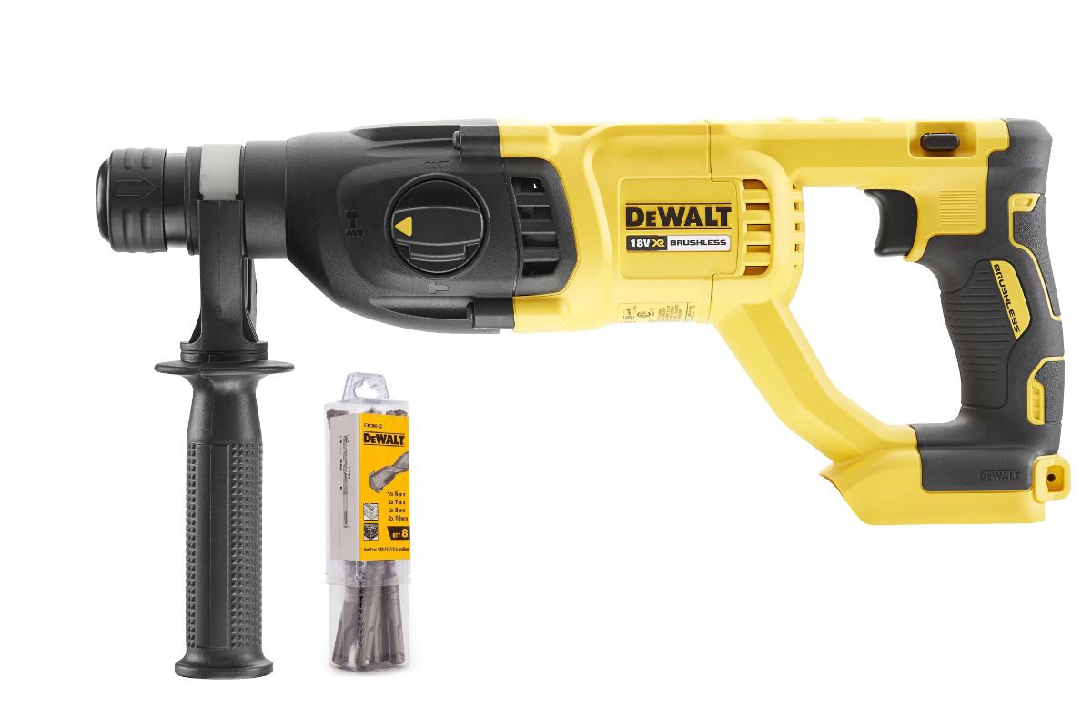 В состав набора входят: Перфоратор DEWALT DCH133N-XJ 18В SDS-Plus 3 режима 2.6Дж без батарей и з/у, Набор буров DeWalt DT60300-QZ SDS+, 8шт в тубе
