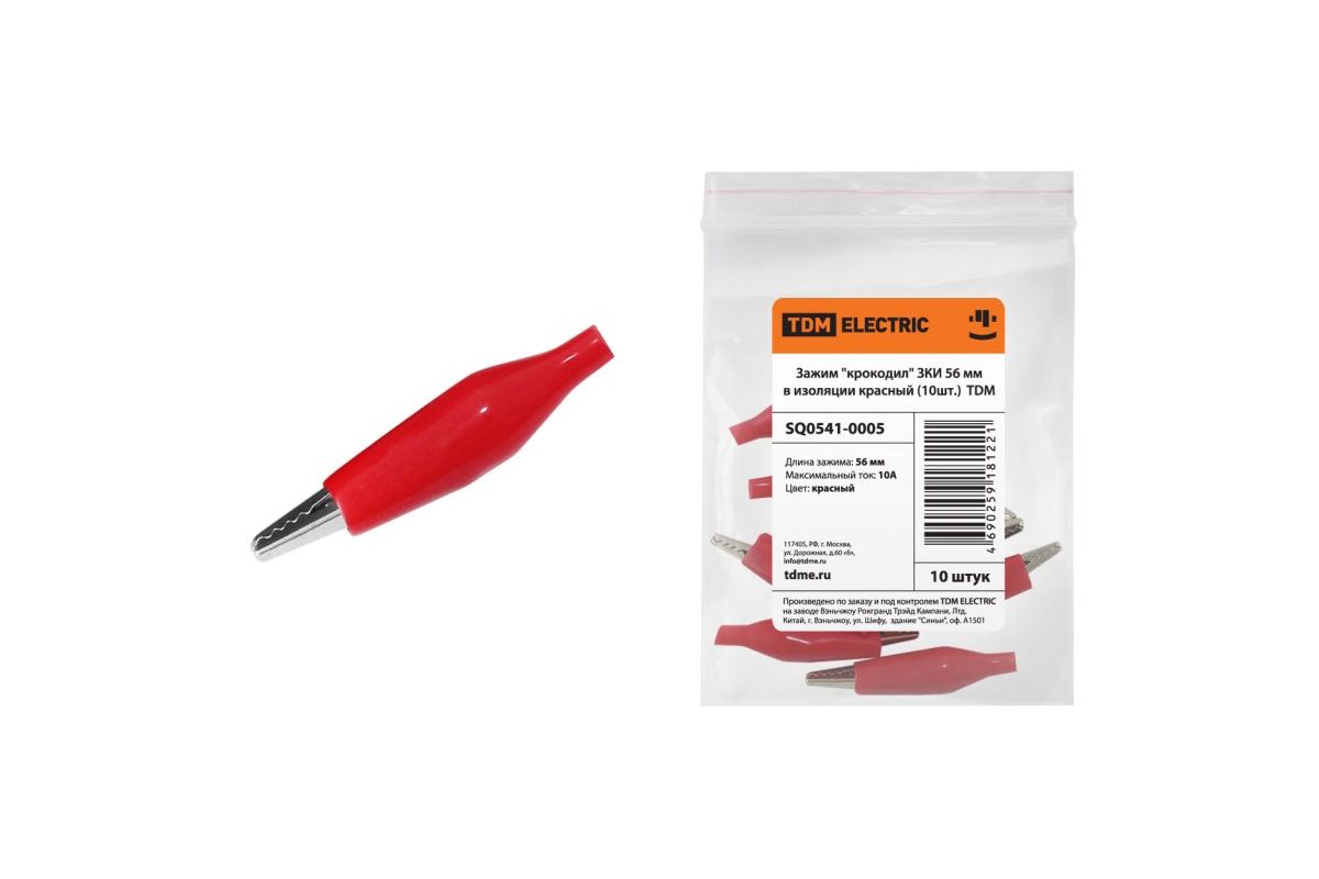 Зажим TDM SQ0541-0005 ''крокодил'' ЗКИ 10А 56мм в изоляции красный 10шт.
