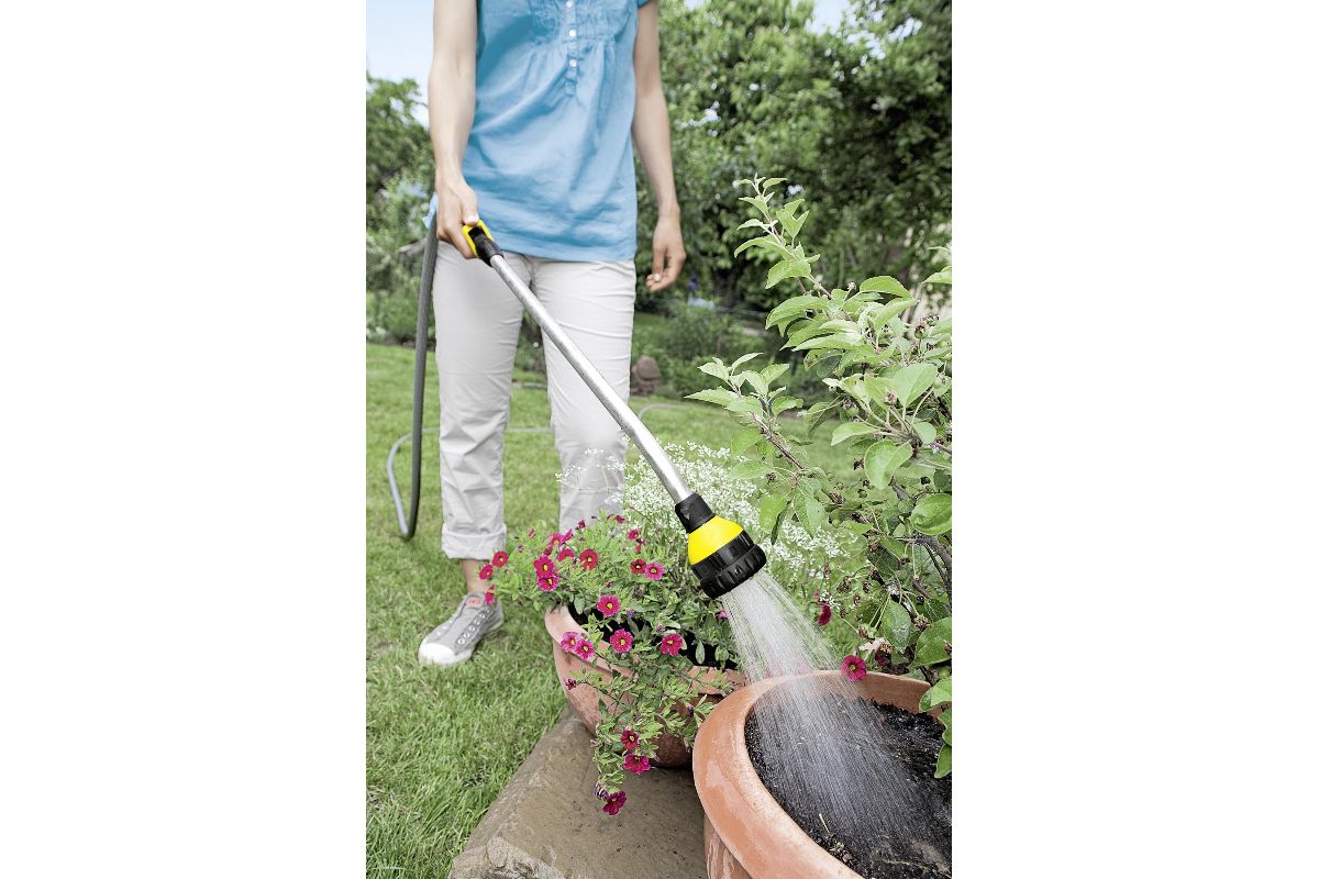 Штанга для полива, 6 типов струи. Легко и просто поливать, высоко расположенные цветы в горшках. Не нужно наклонятся, чтобы точно и аккуратно полить отдельные растения на грядке или полить почву у корней, не намочив листья и цветы. Мыть дорожки и мебель на даче.