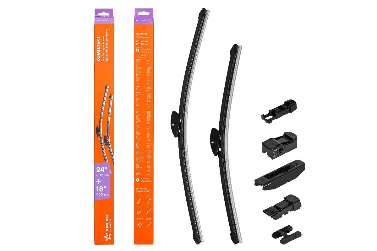 Щетки стеклоочистителя 600/450 мм (24''/18'') бескаркасные, 2 шт. 6 адаптеров (AWB-BK-600-450K) AIRLI