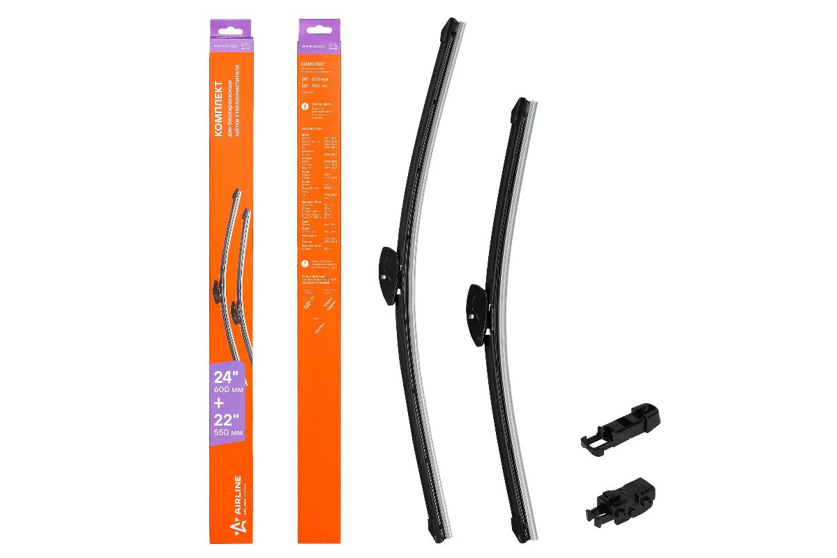 Щетки стеклоочистителя 600/550 мм (24''/22'') бескаркасные, 2 шт. 3 адаптера (AWB-BK-600-550K) AIRLIN