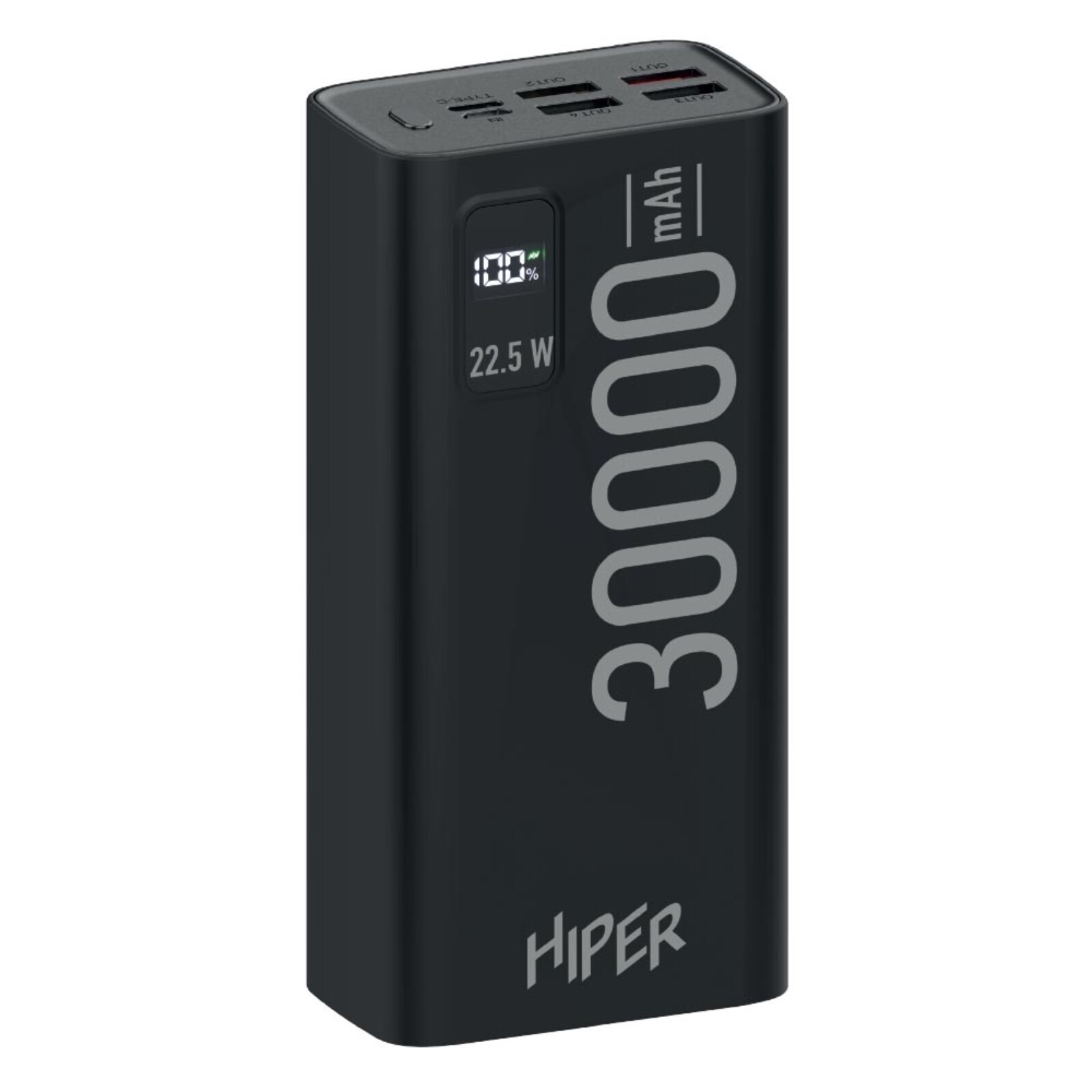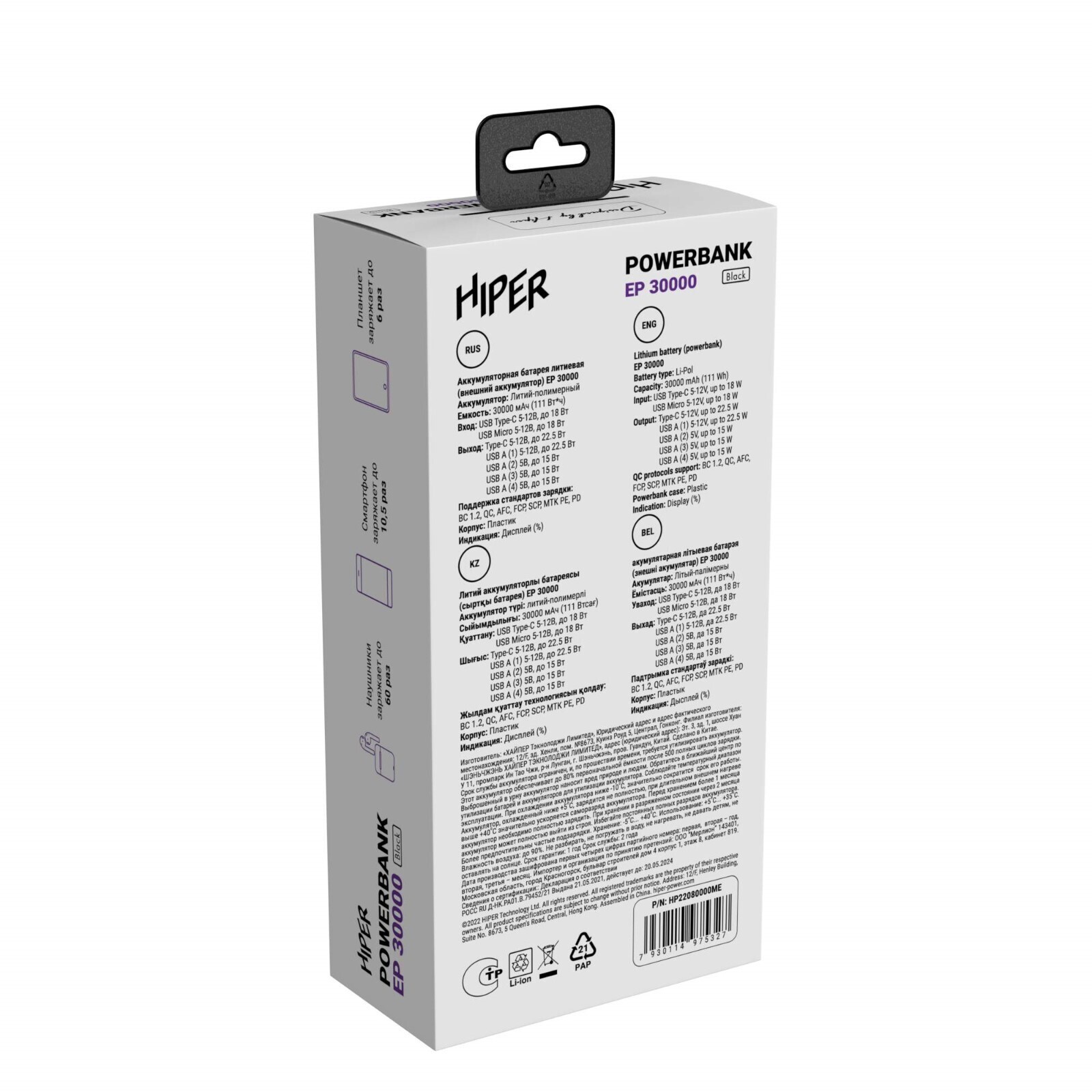 Внешний аккумулятор Hiper EP 30000, 30000 мАч, 3A, 4 USB, QC, PD, дисплей, черный