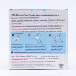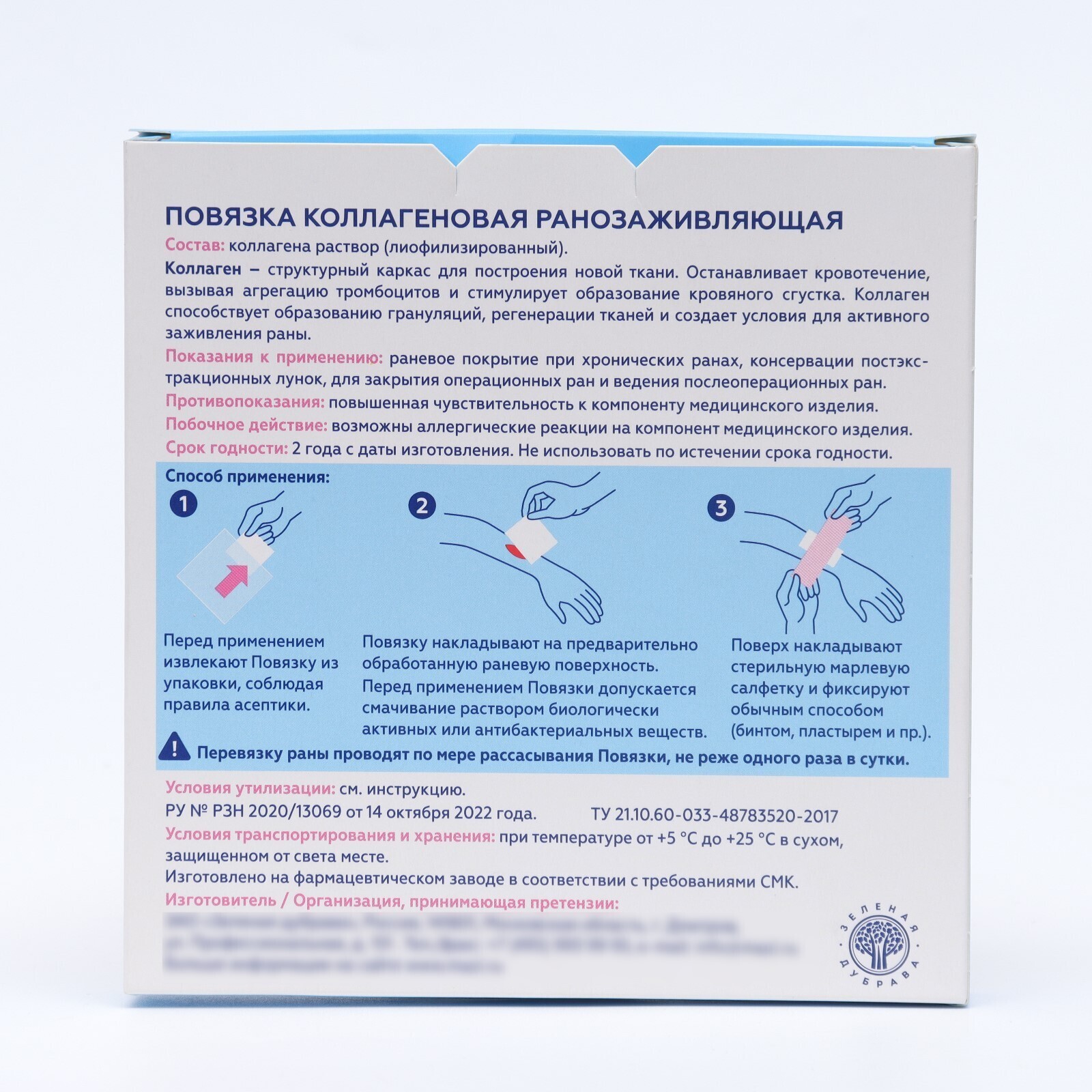 Повязка коллагеновая ранозаживляющая. Коллаген – структурный каркас для построения новой ткани. Останавливает кровотечение, вызывая аграгацию тромбоцитов и стимулирует образование кровяного сгустка. Коллаген способствует образованию грануляций, регенерации тканей и создает условия для активного заживления раны. Рекомендовано при раневом покрытии или хронических ранах, консервации постэкстракционных лунок, для закрытия операционных ран и ведения послеоперационных ран.