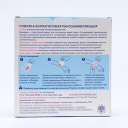 Повязка коллагеновая ранозаживляющая. Коллаген – структурный каркас для построения новой ткани. Останавливает кровотечение, вызывая аграгацию тромбоцитов и стимулирует образование кровяного сгустка. Коллаген способствует образованию грануляций, регенерации тканей и создает условия для активного заживления раны. Рекомендовано при раневом покрытии или хронических ранах, консервации постэкстракционных лунок, для закрытия операционных ран и ведения послеоперационных ран.