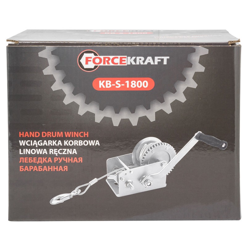ForceKraft FK-KB-S-1800 - ручной инструмент барабанного типа, предназначенный для подтягивания и перемещения грузов весом до 810 кг. Его отличает простая конструкция и доступное любому управление. Для исключения самопроизвольного поворота барабана предусмотрен храповый механизм.