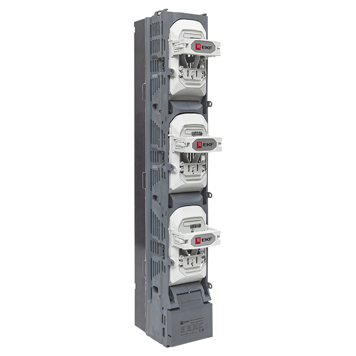 Выключатели-разъединители УВРЭ вертикальные EKF PROxima откидного типа с плавкими предохранителями предназначены для ручного включения-отключения и для защиты от коротких замыканий и перегрузки цепей переменного тока с номинальным напряжением до 690 В частотой 50 Гц (предохранители в комплект поставки не включены). Применяются во вводно-распределительных устройствах, распределительных и шкафах управления и др. Видимый разрыв обеспечивается благодаря откидной крышке, оснащенной держателями предохранителей. При открывании крышки происходит разрыв цепи (первый разрыв происходит в верхней части). Она также выполняет функцию фронтальной защиты от прикосновений. Конструктивно УВРЭ EKF PROxima состоит из трехполюсного основания с контактными зажимами предохранителей, изготовленного из негорючего полиамида со стекловолокном, двух клеммных крышек (верхняя крышка оснащена дугогасительными камерами, за исключением УВРЭ 160 А) и откидной крышки с держателями предохранителей. В крышке предусмотрены контрольные отверстия для измерения напряжения и других параметров специальным щупом. Выключатели устанавливаются на монтажную панель. Конструкция контактных выводов обеспечивает болтовое присоединение шин или проводников, оконцованных кабельными наконечниками. Выводы изготавливаются из меди с антикоррозийным покрытием. Выключатели могут дополнительно оснащаться электромеханическим дополнительным контактом состояния NO + NC. Возможна коммутация алюминиевым и медным проводом.