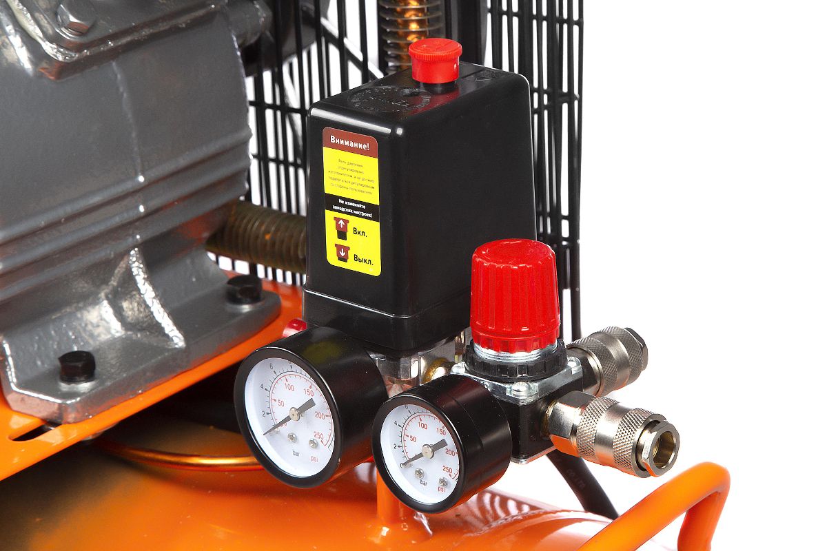 - Два манометра, показывающие давление воздуха на выходе из компрессора и в ресивере
