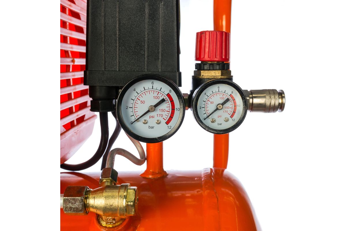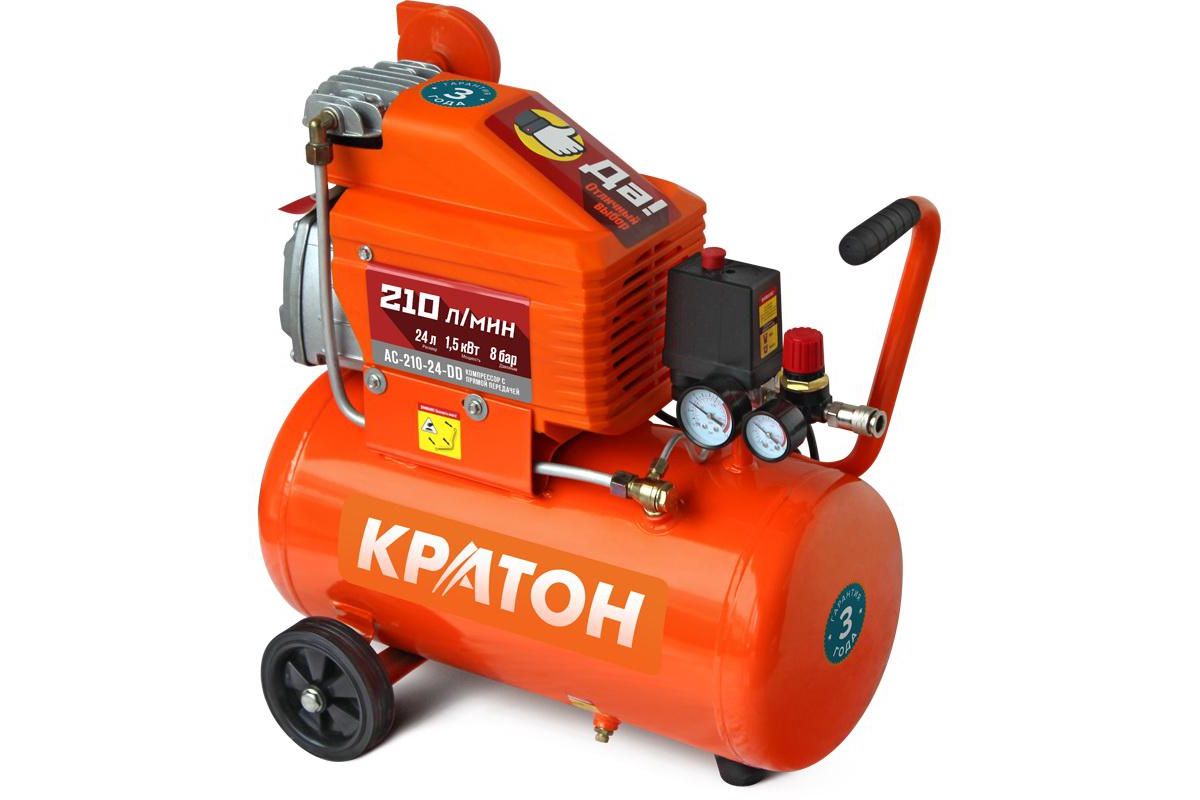 КРАТОН AC-210-24-DD – поршневой прямоприводной компрессор. Двигатель мощностью 1500 Вт нагнетает до 210 литров воздуха в минуту. Подойдёт для накачивания шин, продувки и работы с аэрографами. Ресивер на 24 л делает компрессор компактным и мобильным.